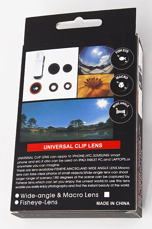 - * Three Alternative Style Lens Clip * 1 x 2.3" approx. * Fish Eye, Macro, and Wide Angle Lens