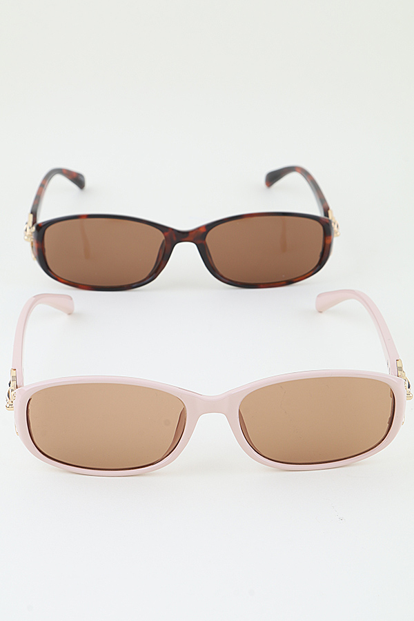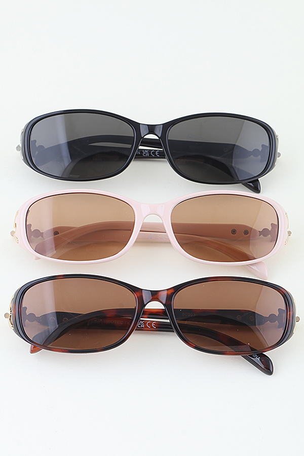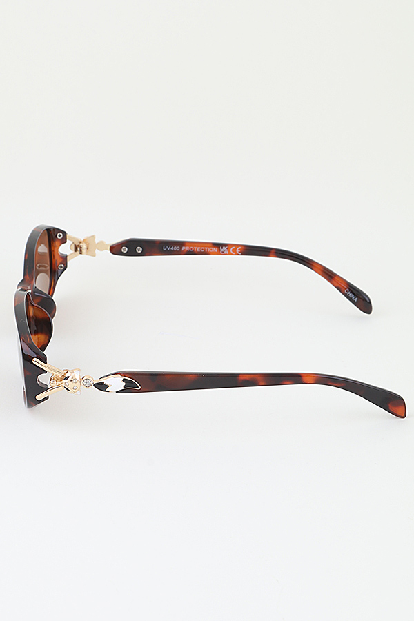 - * These Bejeweled Fox Frame Sunglasses from H&D Accessories feature a sleek, retro-inspired oval frame accented with delicate bejeweled fox-head details at the temples, paired with tinted lenses that offer UV protection. Available in classic black, soft pink, and tortoise finishes, they are perfect for vintage-themed outings, brunch dates, or city street style, adding a polished, eye-catching touch to any casual or elevated outfit.