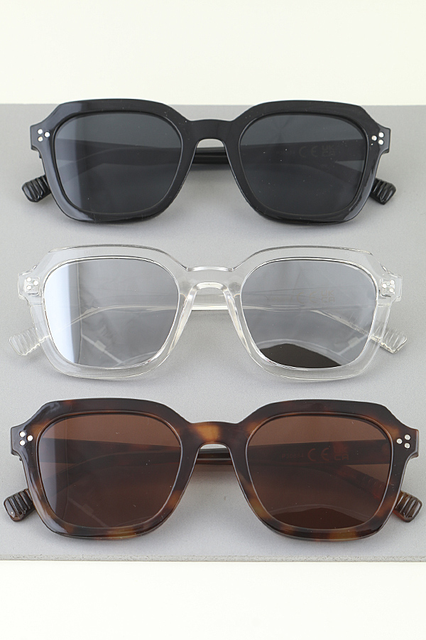 - * Triple Bolted Wayfarer Sunglasses from H&D Accessories feature a structured, angular wayfarer frame with three decorative rivets at each temple, crafted from a durable, lightweight material and fitted with UV-protective lenses for reliable sun coverage. The textured temple ends ensure a secure, comfortable fit, making these sunglasses perfect for everyday commutes, weekend getaways, or casual outings, blending timeless retro style with modern everyday functionality.