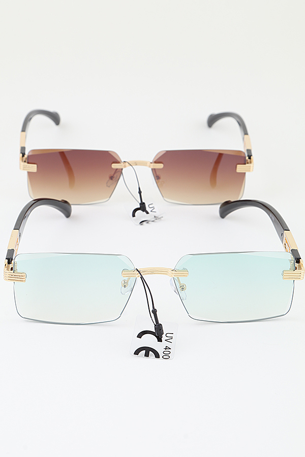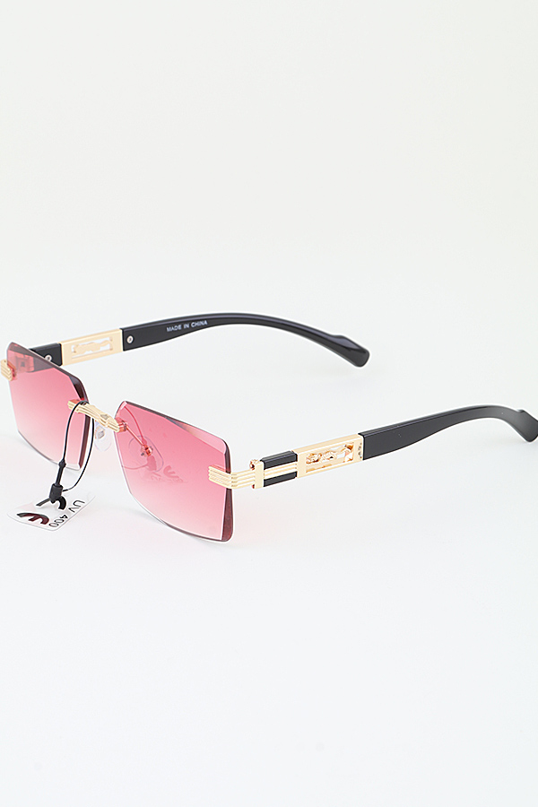 - * This Chic Jaguar Rimless Sunglasses from H&D Accessories features a sleek rimless design with bold, rectangular lenses. The frame highlights decorative metal accents (including embossed jaguar motifs on the side details) paired with textured metallic hardware for a distinctive touch. Lightweight, thin temples ensure comfortable wear, while the UV-protective lenses add functional value. Offered in varied lens styles, it merges edgy detailing with modern rimless minimalism— a statement accessory with refined flair.