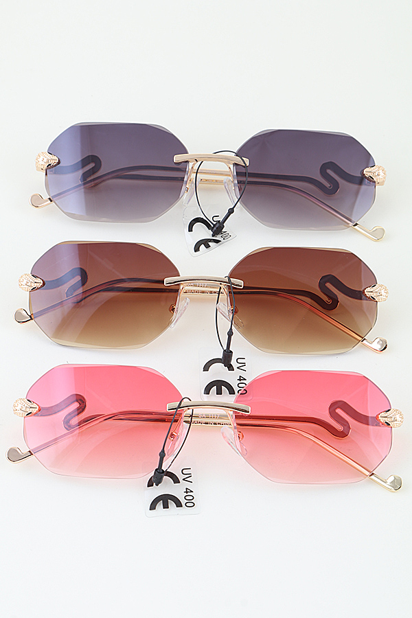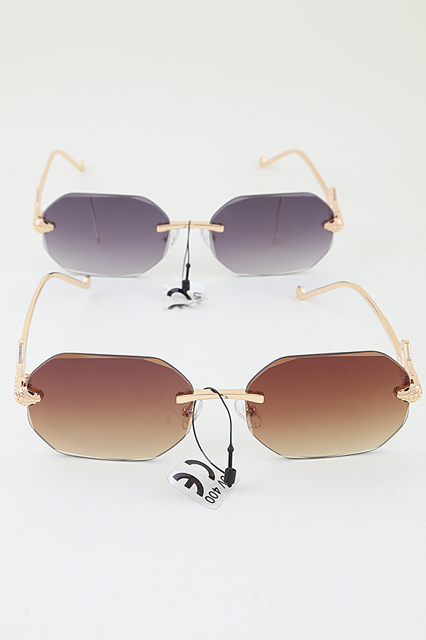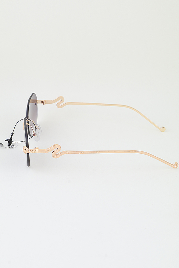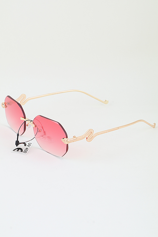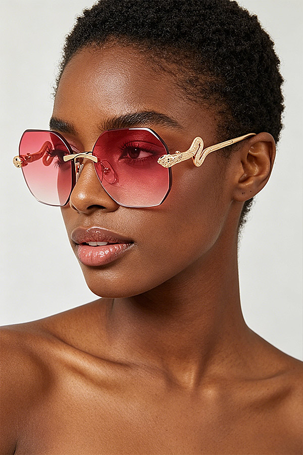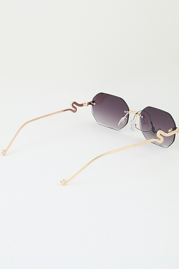 - * These Slithering Snake Gradient Sunglasses from H&D Accessories feature a sleek, rimless octagonal frame with a polished, reflective finish, accented with intricate snake-inspired details along the inner temples and ornate decorative accents at the frame corners, fitted with gradient lenses that offer full UV 400 protection to shield eyes from harmful sun rays, available in a range of vibrant lens color options, lightweight and comfortable for extended wear, perfect for elevating summer outfits, beachwear, vacation looks, or evening ensembles for a chic, statement-making aesthetic.
