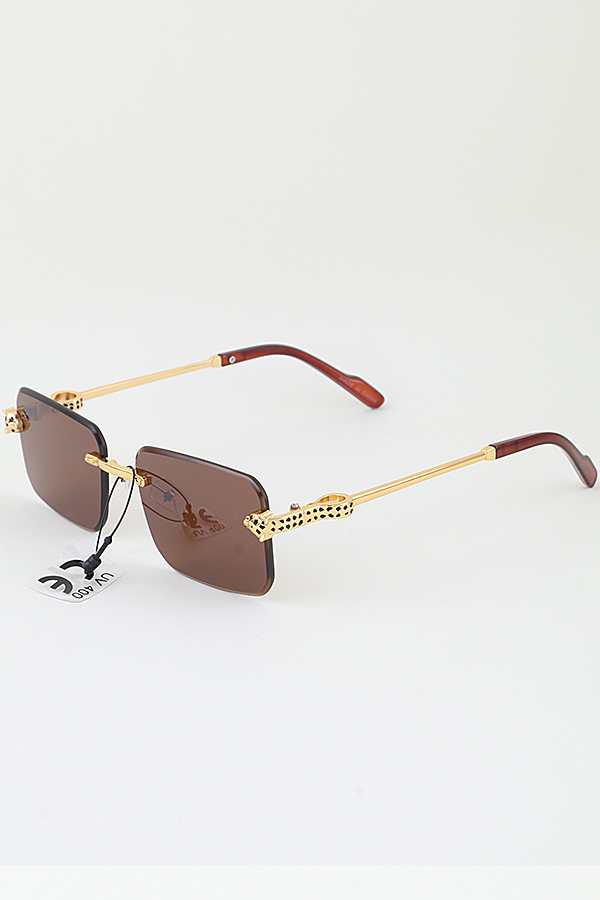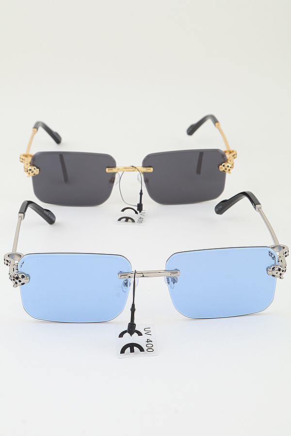 - * This Modern Cheetah Rimless Sunglasses from H&D Accessories features a sleek rimless square lens design, adorned with intricate cheetah-head decorative hardware at the front hinges and temple arms, complete with spotted detailing for a wild, luxurious touch, paired with smooth temple tips for a comfortable fit, while the tinted lenses offer UV400 protection; its bold, opulent silhouette makes it a standout accessory to elevate formal evening attire or add sophisticated edge to upscale daytime events and special occasions.