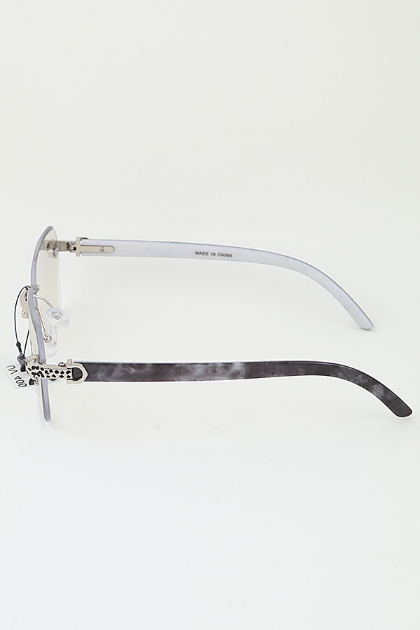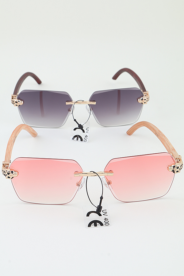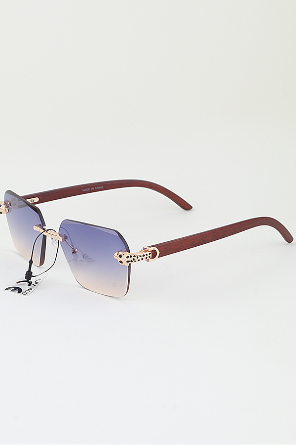- * This Luxury Cheetah Gradient Sunglasses from H&D Accessories features a sleek rimless geometric lens design, adorned with intricate cheetah-head decorative hardware at the front hinges complete with spotted detailing, paired with textured wood-like temple arms for a refined natural aesthetic, while the gradient lenses offer UV400 protection and a subtle tonal fade; its opulent minimalist silhouette makes it a standout accessory to elevate formal evening attire or add sophisticated luxury to upscale daytime events and special occasions.