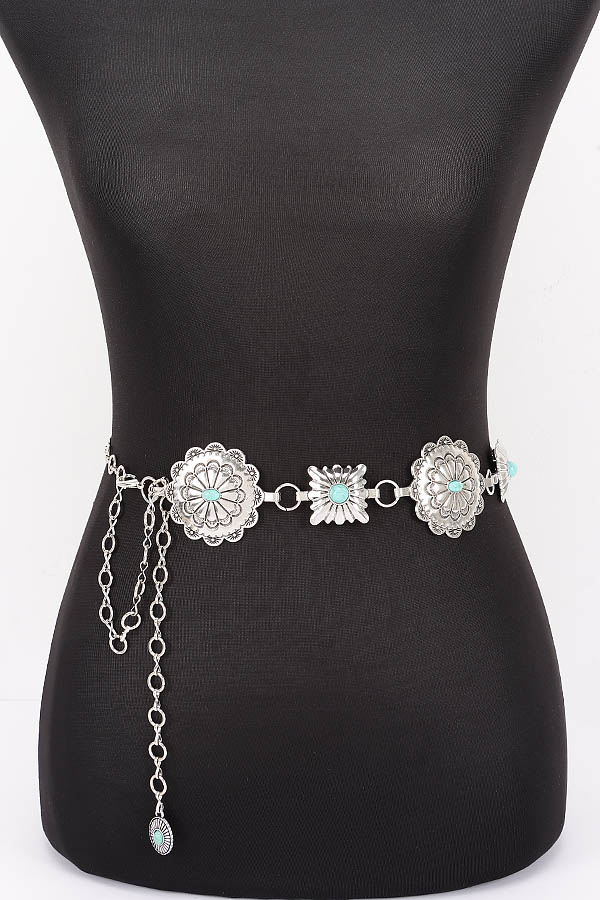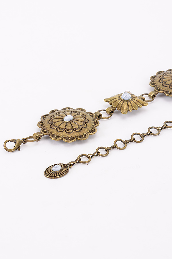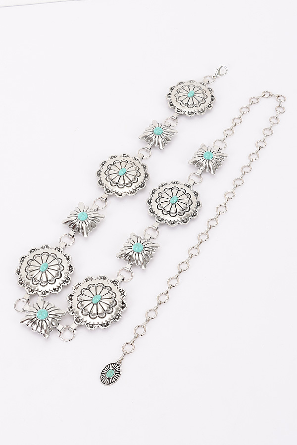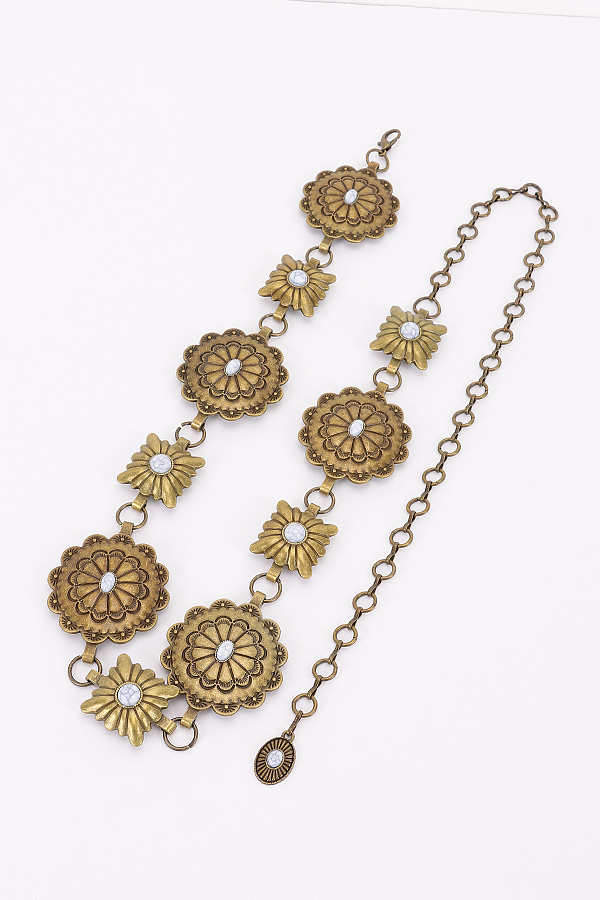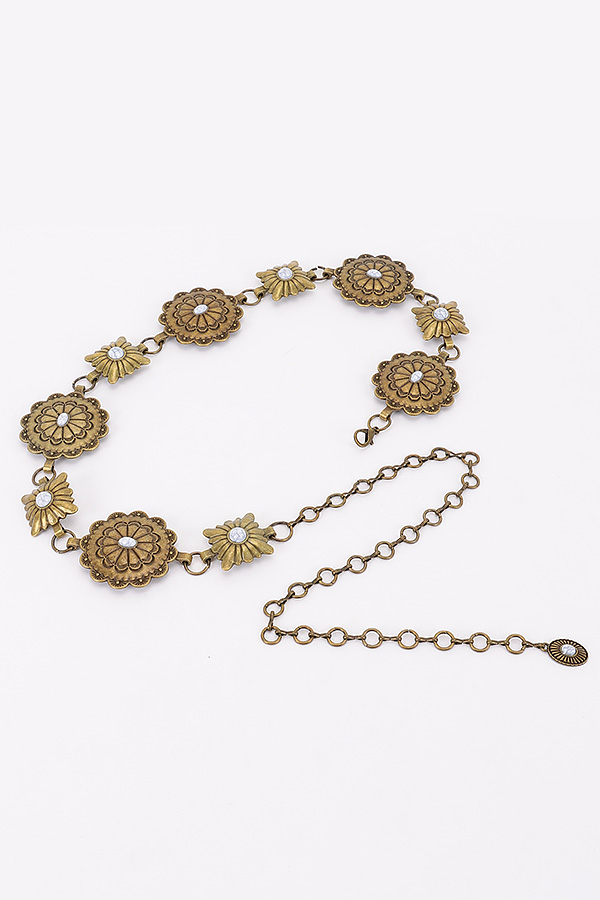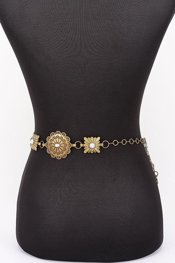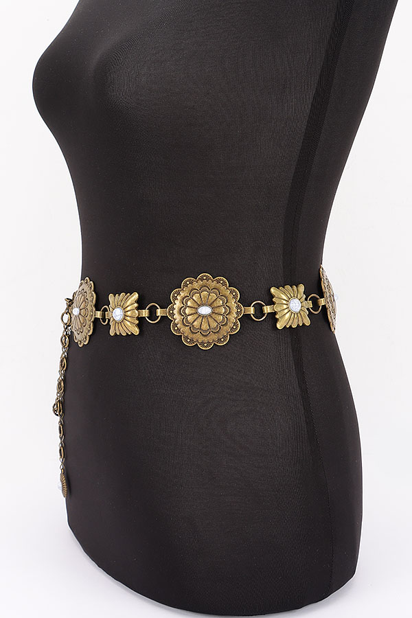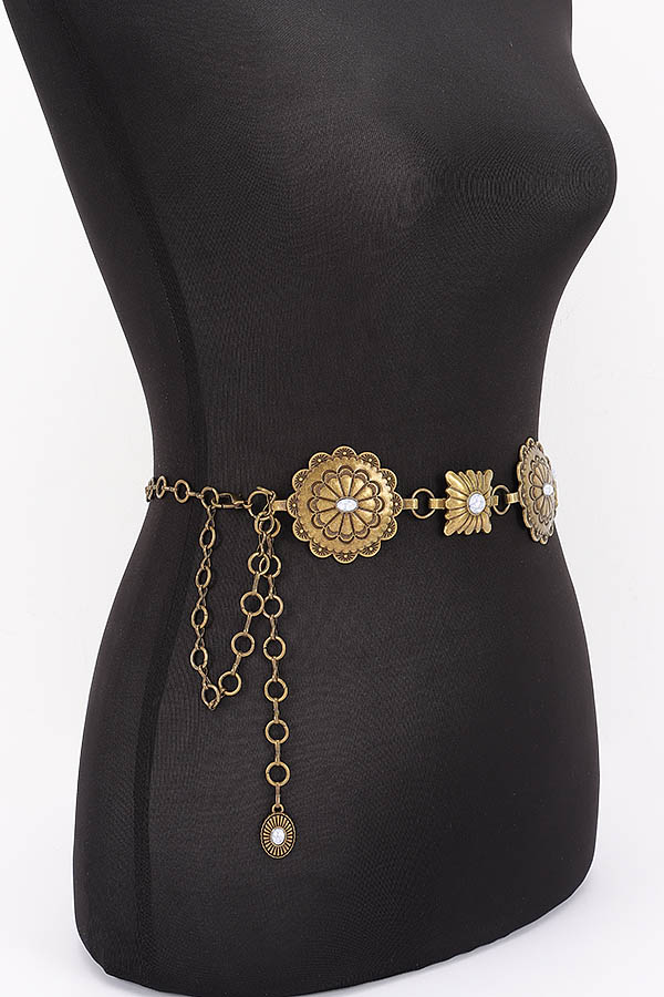 • * This Vintage Metal Chain Belt from H&D Accessories features an ornate design with floral - shaped metal pieces and a dangling chain detail. It has an antique and elegant appearance, giving it a sophisticated and retro vibe.