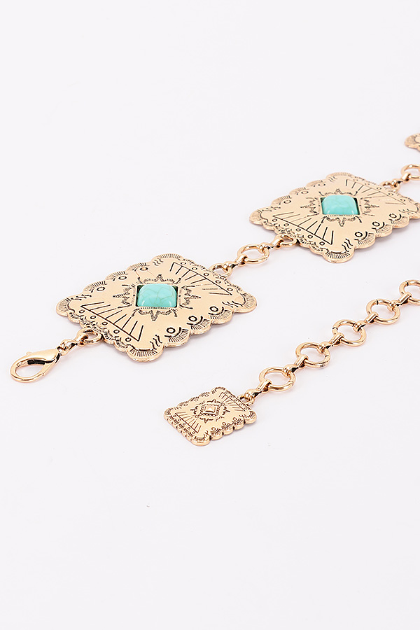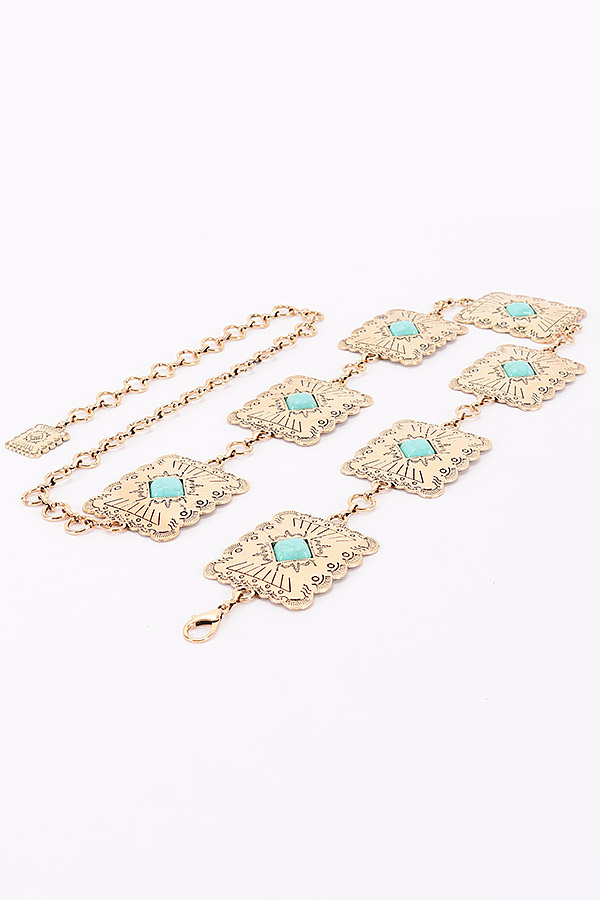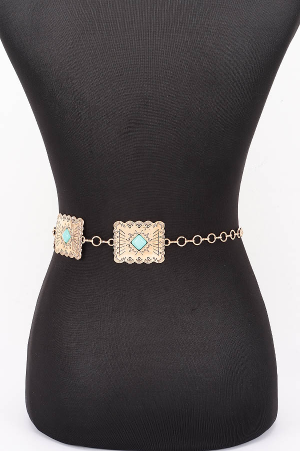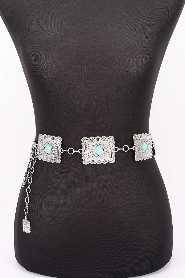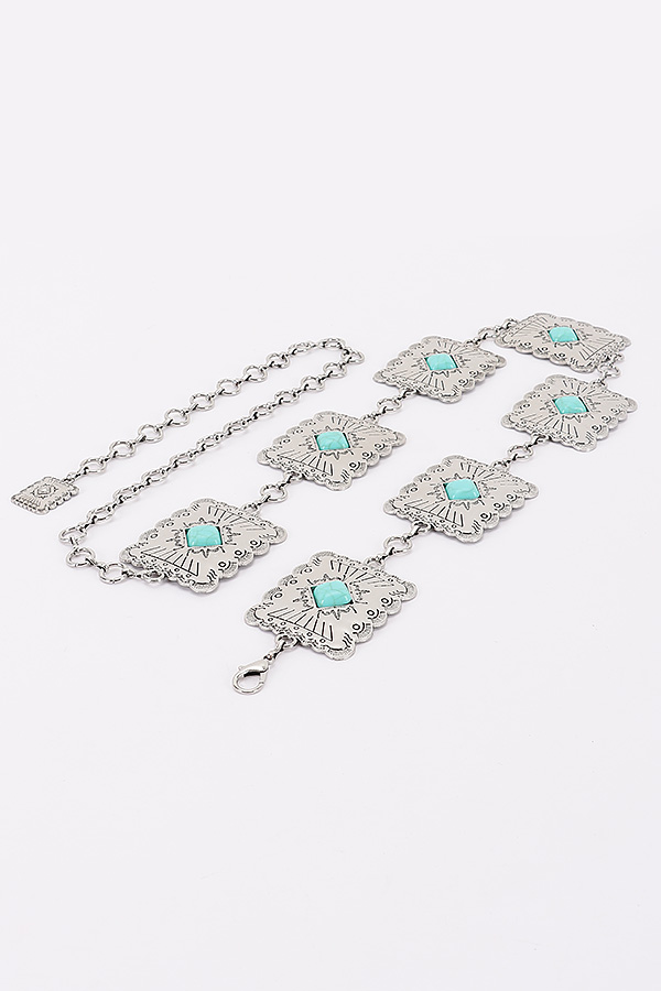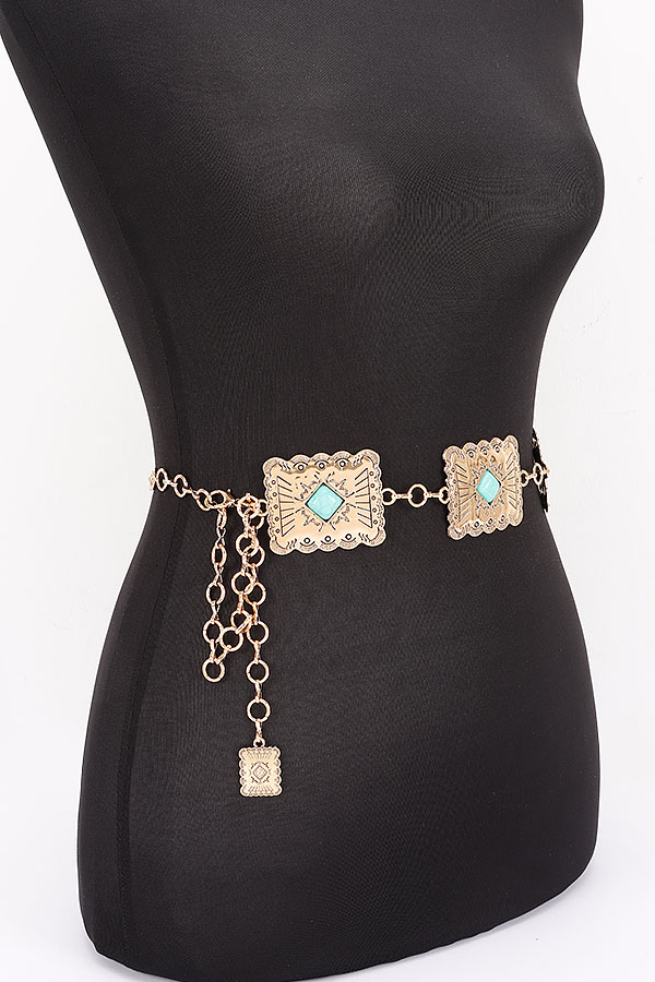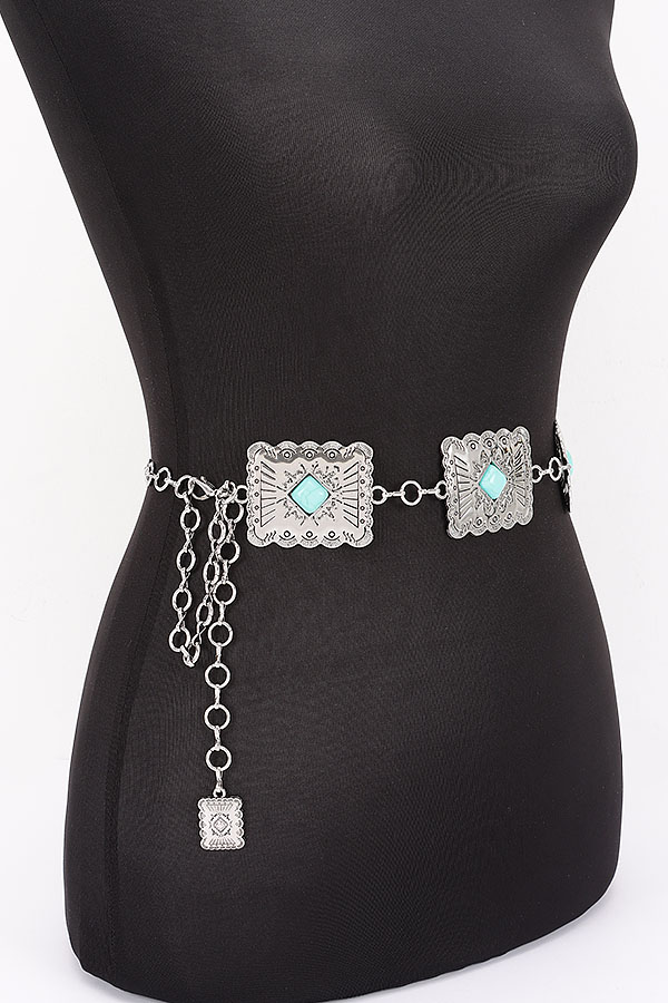 • * This Western Turquoise Accent Chain Belt from H&D Accessories features a design with turquoise accents and intricate metalwork, along with a dangling chain detail. It has a Western and stylish appearance, giving it a bold and distinctive vibe.