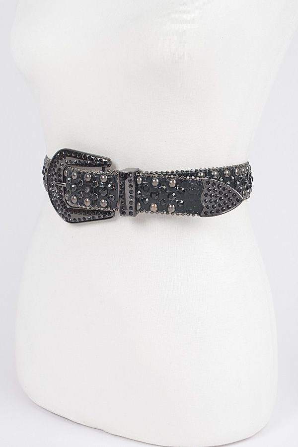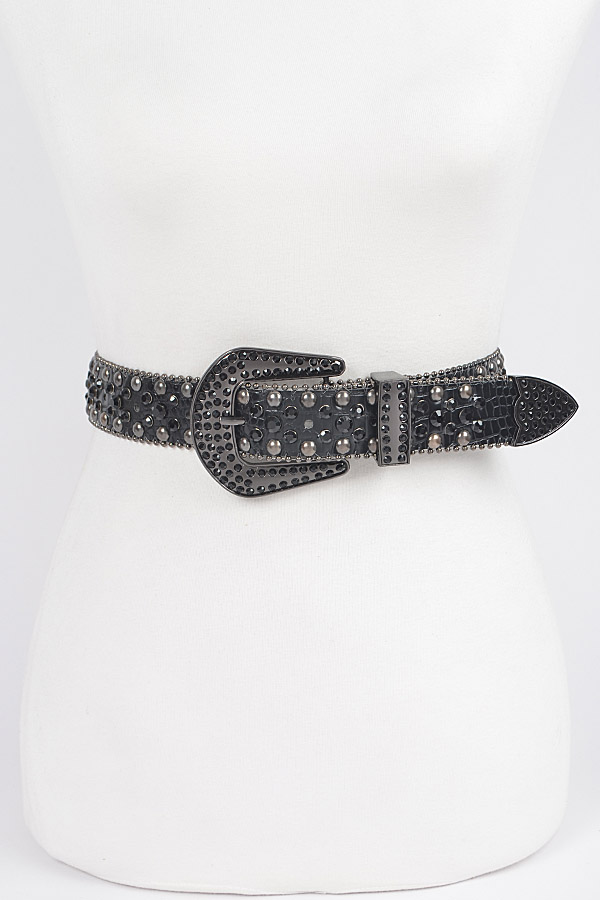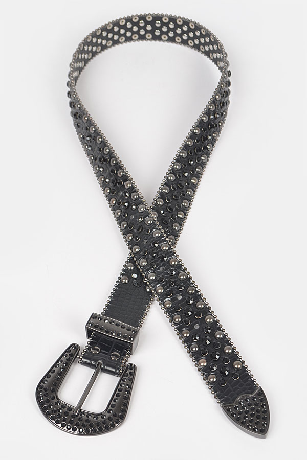 • * Introducing the "Rhinestone Metal Studded Multi Metal Belt" – a stunning black belt that combines elegance and edge with its striking black studded buckle. Elevate your style with this versatile accessory from H&D Accessories, perfect for any occasion.