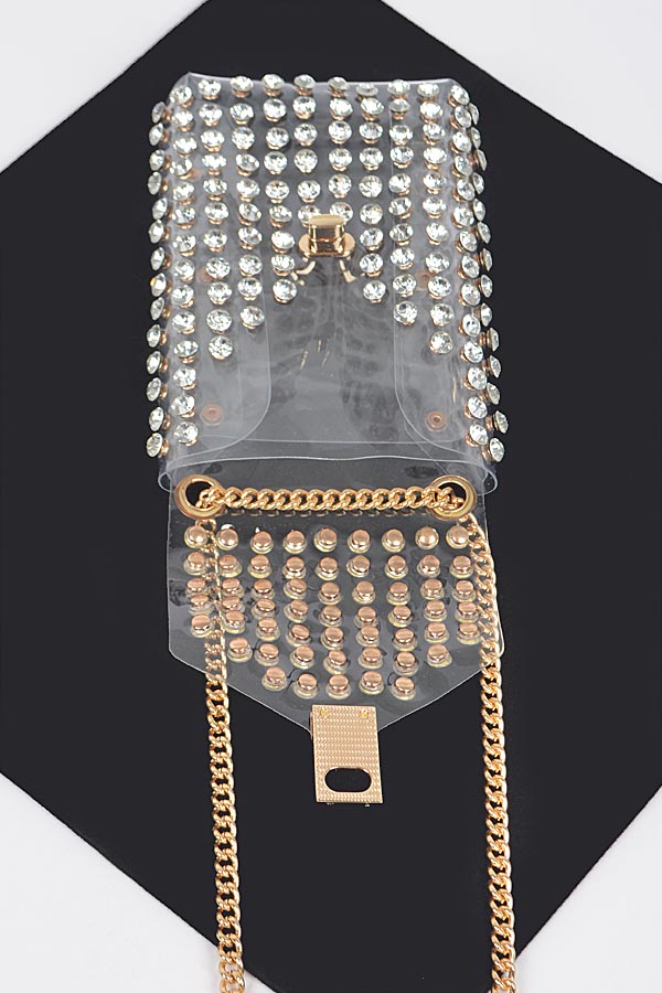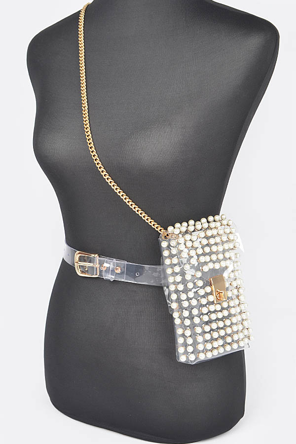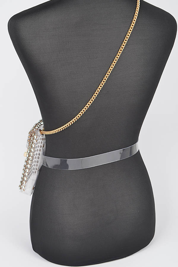- *This is a glamorous Rhinestone Clear Belt Bag W/Chain from H&D Accessories. It features a transparent body densely encrusted with sparkling rhinestones, complemented by a metal chain strap and a clear belt for versatile wearing. This bag is perfect for adding a dazzling touch to your evening looks. You can sport it at a cocktail party, pairing it with a sleek mini dress to instantly elevate your style, or use it for a night of dancing at a club, where it not only holds your essentials but also serves as a standout fashion piece. Its unique design seamlessly combines functionality and glamour, ensuring you shine in any formal or semi-formal occasion.