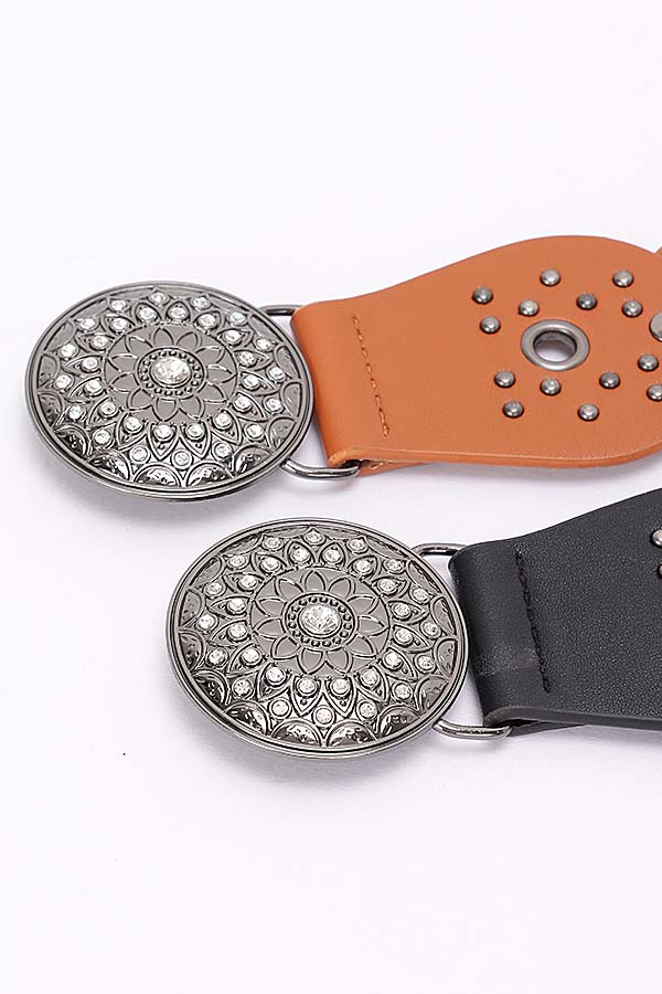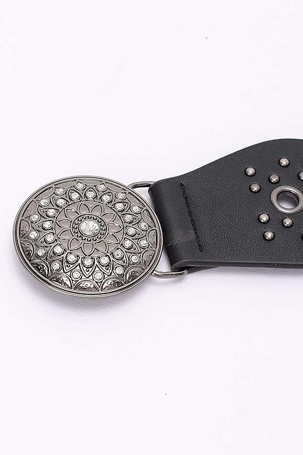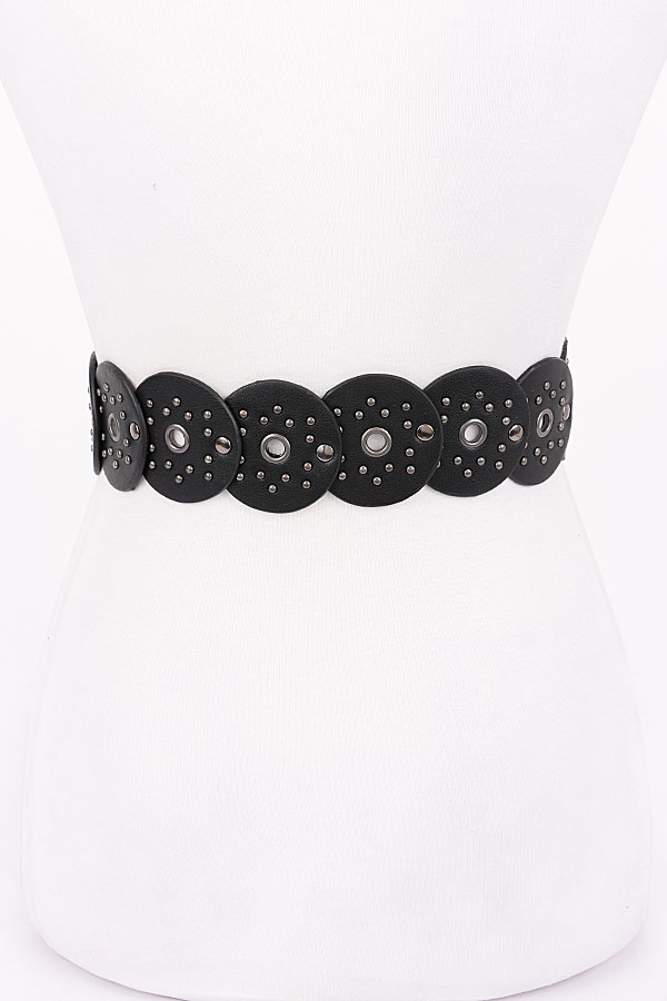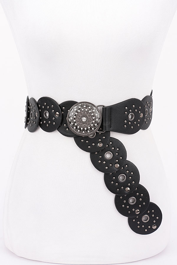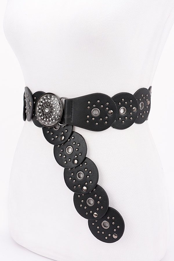 - * Discover the "Multi Metal Round PU Vintage Belt" – a stunning belt featuring eye-catching studs and a vintage-inspired buckle. This versatile piece from H&D Accessories is designed to make a statement, effortlessly enhancing your wardrobe with its bold yet timeless appeal.