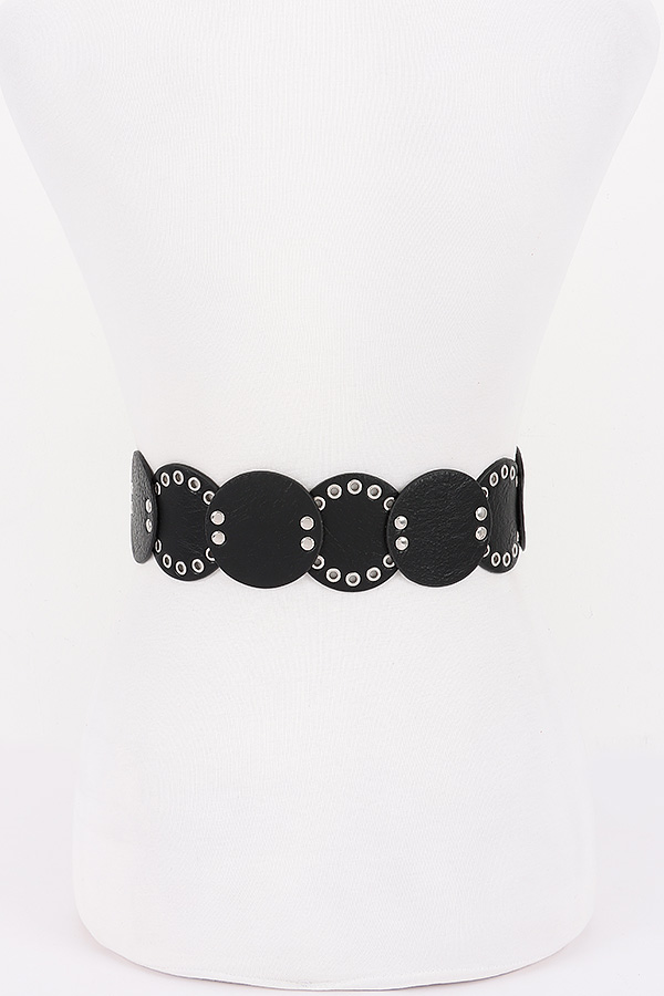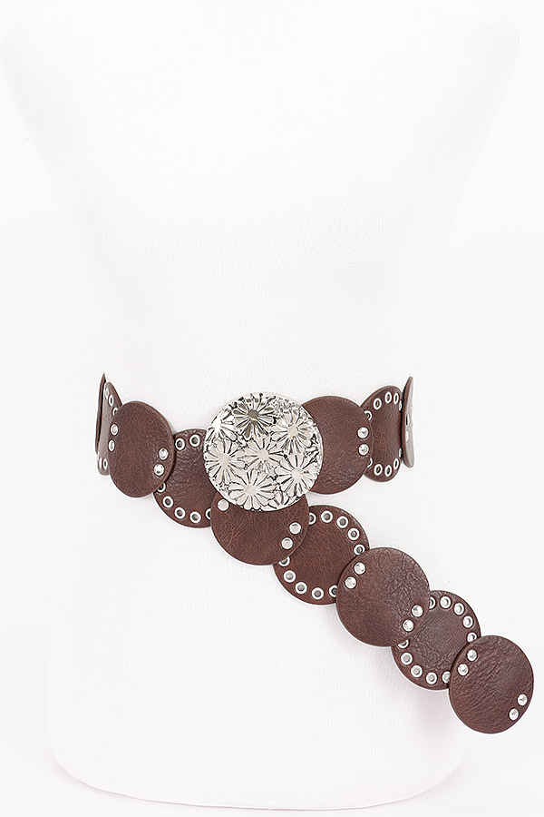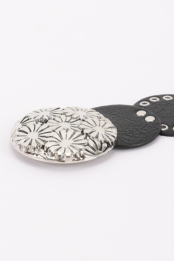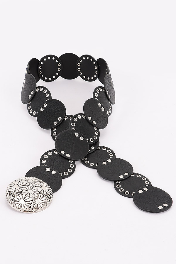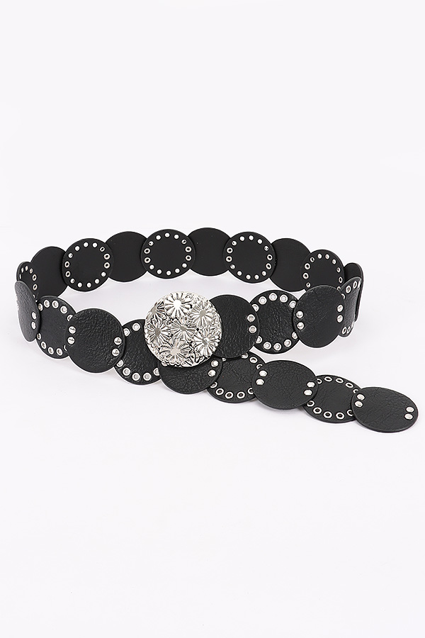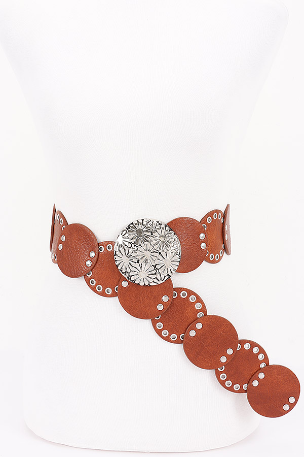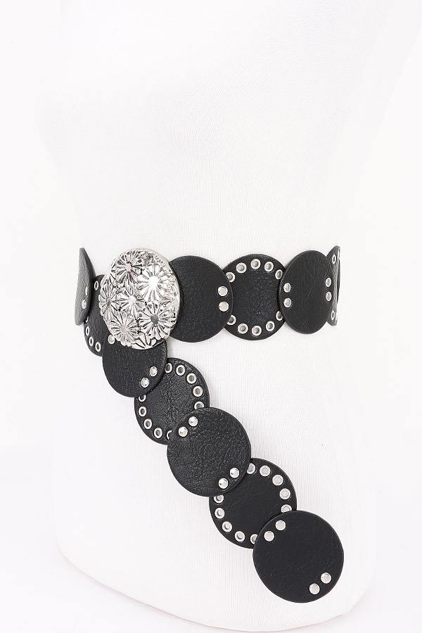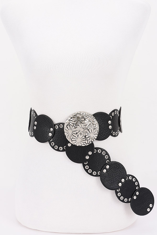 • * Faux Leather Disc Belt from H&D Accessories features a unique design with circular faux leather discs adorned with metal studs. It has a central decorative metal buckle with flower patterns, adding a statement - making touch. The structured yet flexible construction ensures a comfortable fit. Ideal for elevating boho dresses, adding a bold accent to casual outfits, or complementing western - inspired looks, this belt brings a mix of artistry and style to your wardrobe.