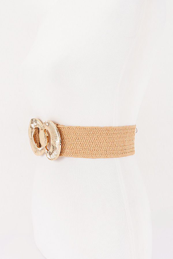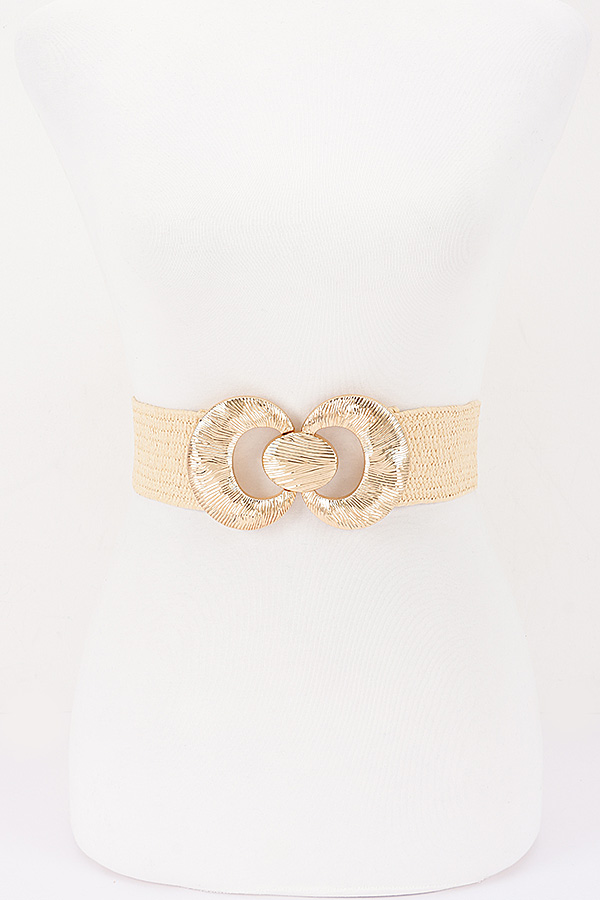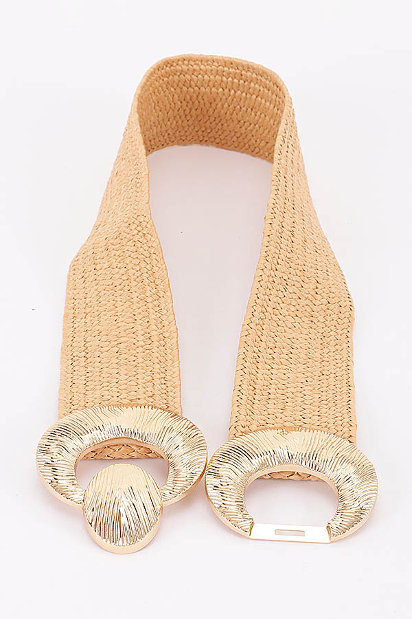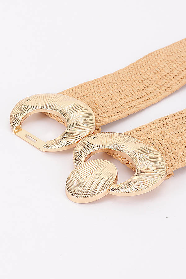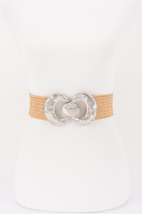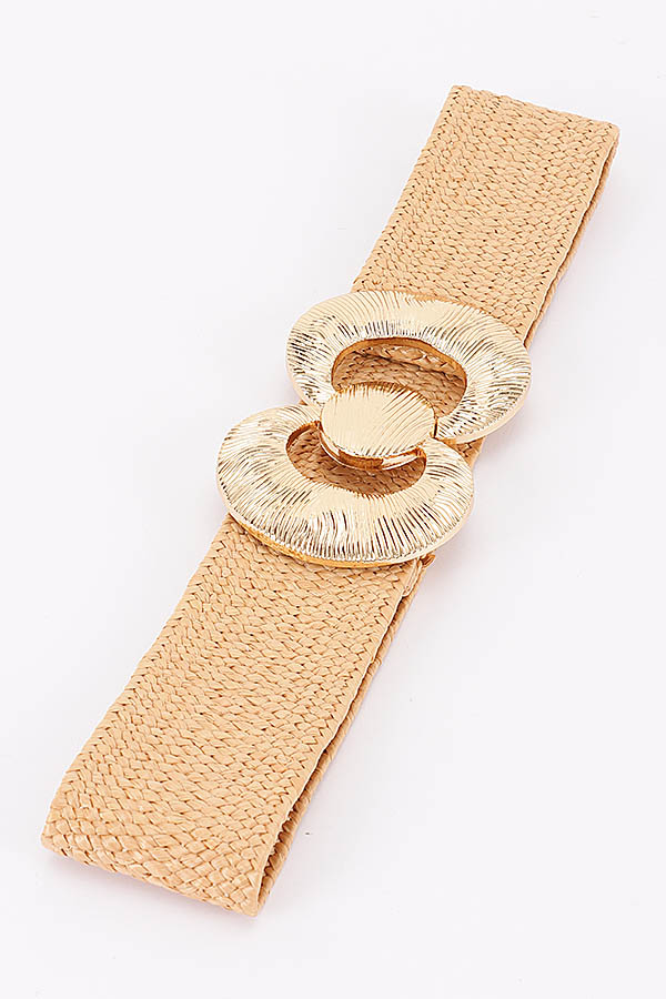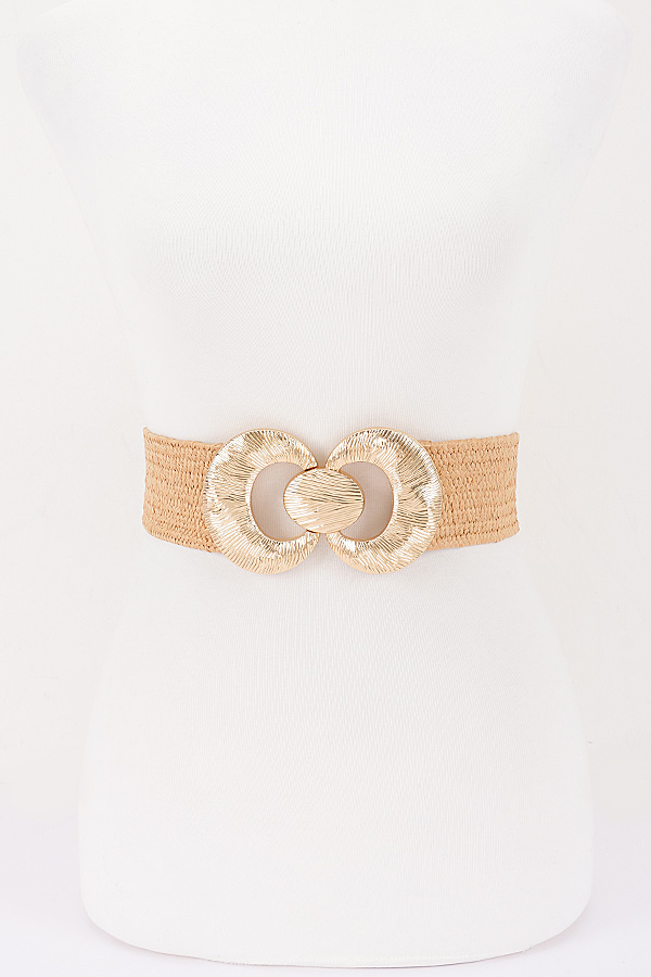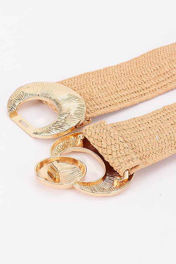 - * This stylish waist belt from H&D Accessories features a wide, flexible woven construction with a textured, artisanal finish, offering comfortable stretch for a tailored fit. It is accented with a prominent, oversized metallic hardware set boasting a circular ring design with intricate engraved detailing, and a coordinating oval snap button closure that adds a bold, decorative focal point to the waist. Perfect for cinching dresses, blouses, or casual outfits to elevate your summer or resort wear look.