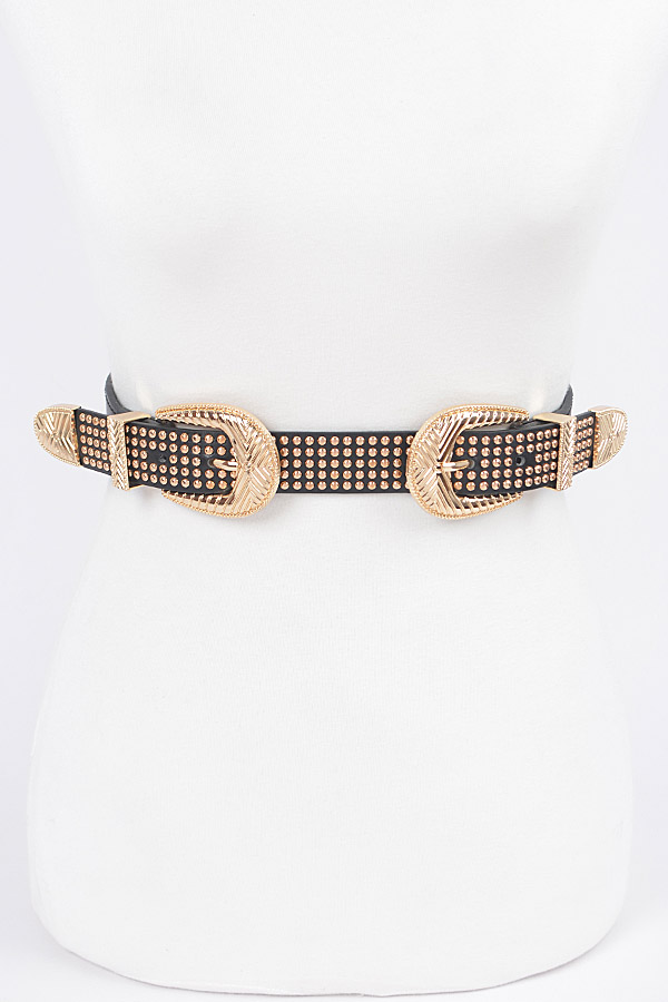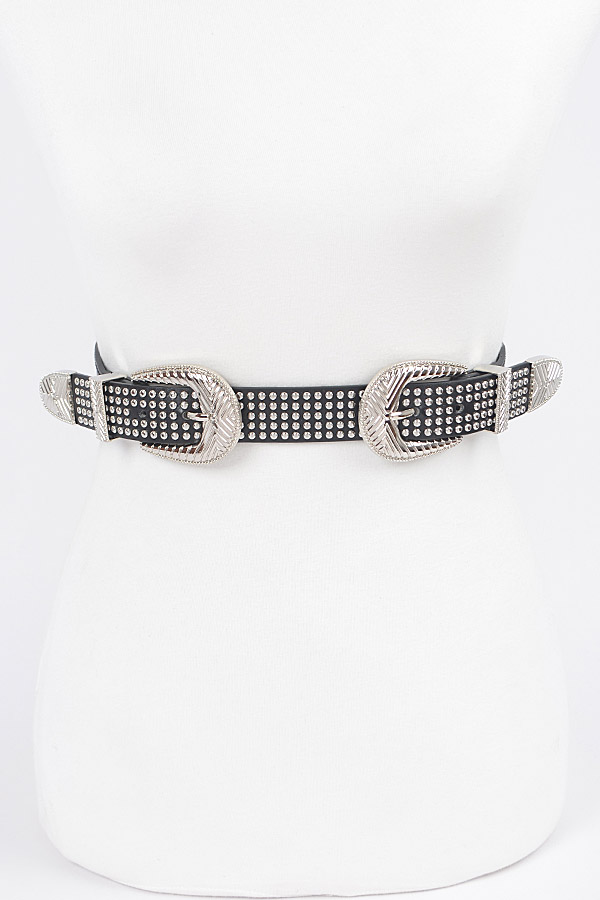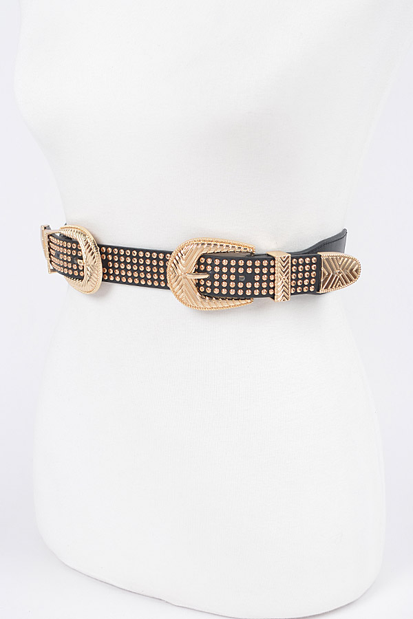 - * Vegan Leather Metal Studded Multi Metal Belt from H&D Accessories features a vegan leather strap adorned with all - over metal studs, paired with intricately designed multi - metal buckles and decorative elements. It offers adjustable fitting for a customized wear. Ideal for adding a bold, western - inspired touch to dresses, denim outfits, or elevating evening looks, this belt seamlessly combines edgy detailing with stylish craftsmanship.