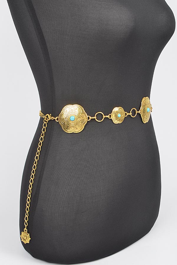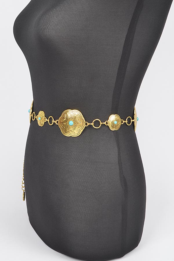 - * This is an elegant Metal Chain Belt W/Turquoise from H&D Accessories. It features intricately designed metal medallions with embedded turquoise-like accents, connected by circular links and a sturdy chain. This belt is perfect for adding an exotic and bohemian flair to your outfits. You can wear it over a maxi dress for a stylish look at a music festival, or pair it with high-waisted jeans and a flowy blouse to elevate your casual ensemble for a dinner date. Its unique design effortlessly blends artistry and fashion, making it a standout piece for any occasion that calls for a touch of cultural charm.
