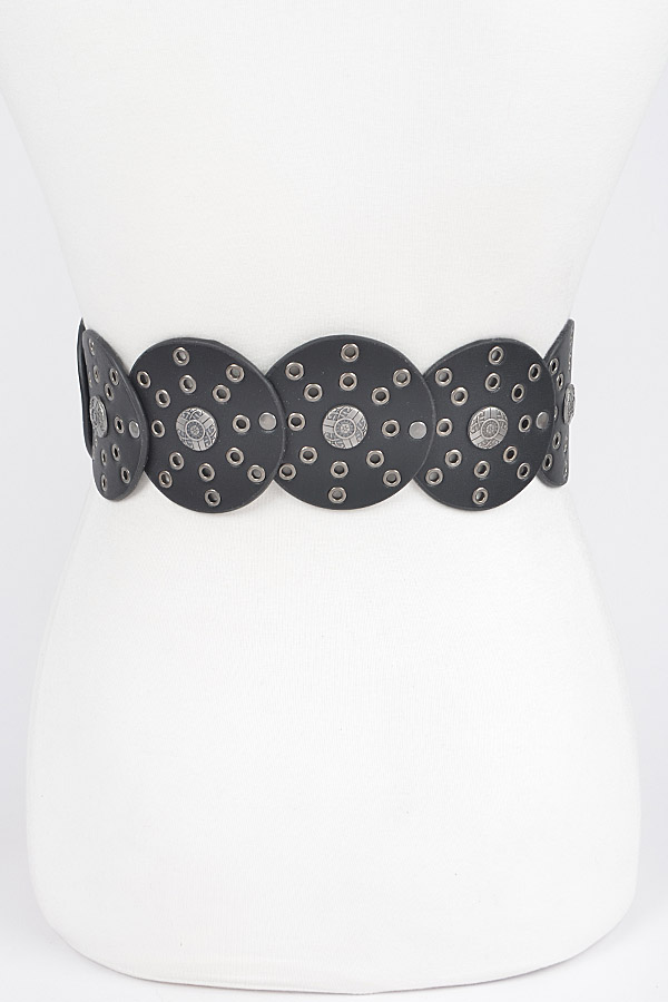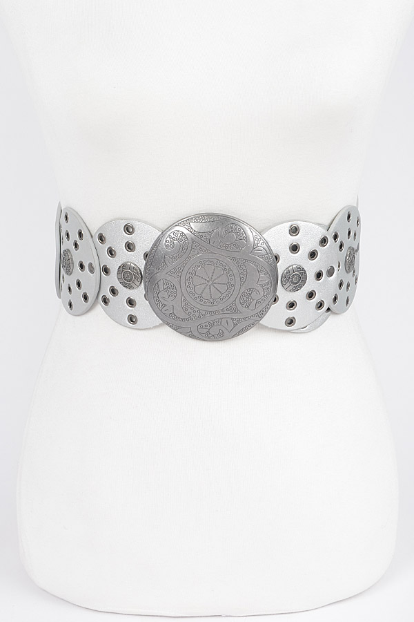 • * Introducing the "Silver Round Buckle Belt"! This name perfectly describes the key features of the product, emphasizing the metal buckle and the silver disc. With its faux leather material and multi eyelet design, this belt is not only stylish but also versatile, making it a must-have accessory.