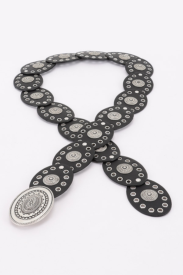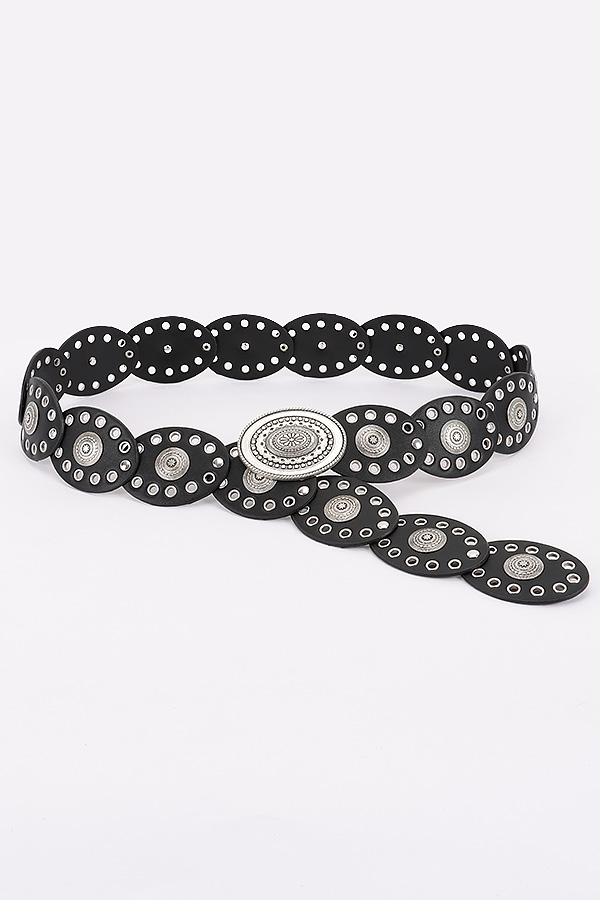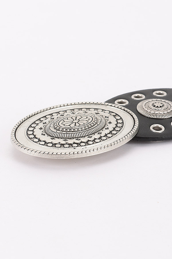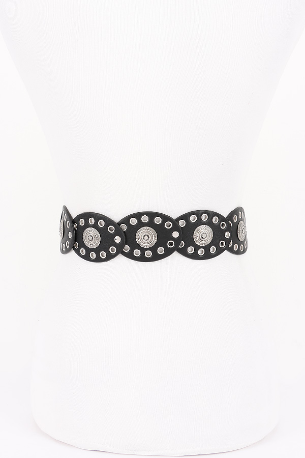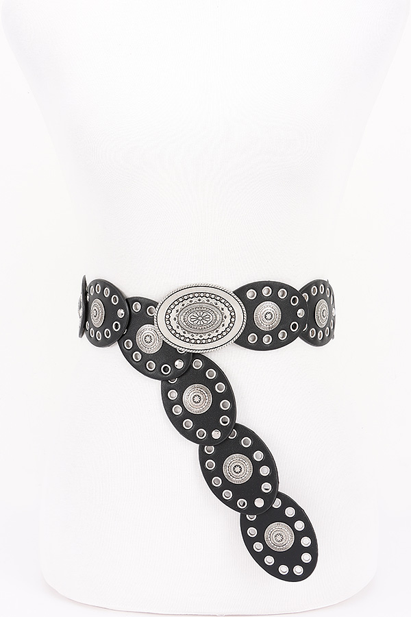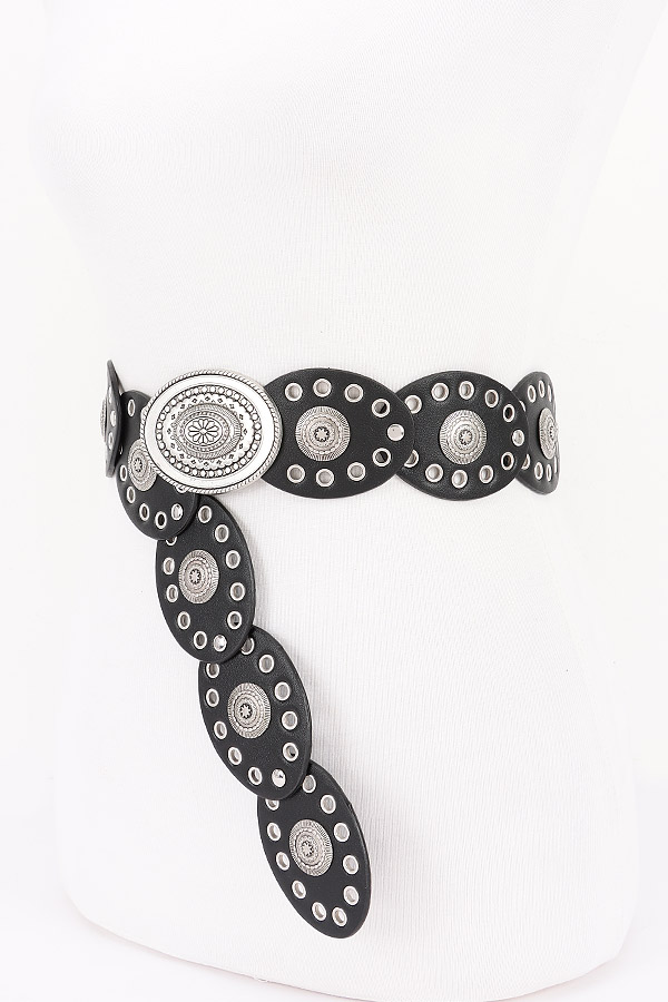- * Introducing the "Silverwood Oval Belt" - a stylish accessory from H&D Accessories that features a combination of silver metal buttons on a faux leather belt. Elevate your outfit with this vintage-inspired piece that adds a touch of elegance to any look.