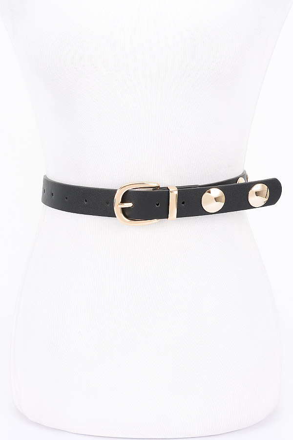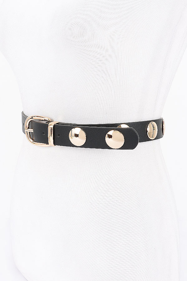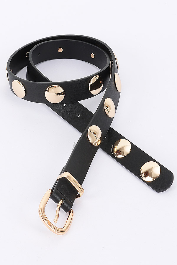 - * Elevate your style with the "Round Metal Studded PU Belt" from H&D Accessories. This striking black belt, adorned with round metal studs and a luxurious metal buckle, is the perfect accessory to add a touch of sophistication to any outfit. Make a bold statement and showcase your unique fashion sense with this must-have piece.