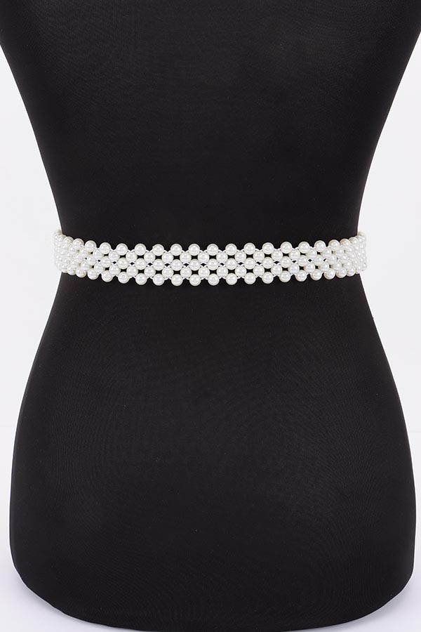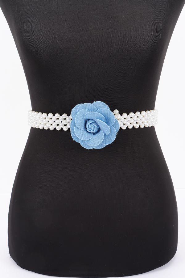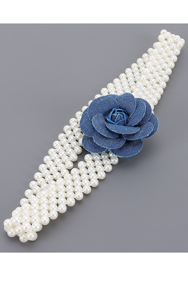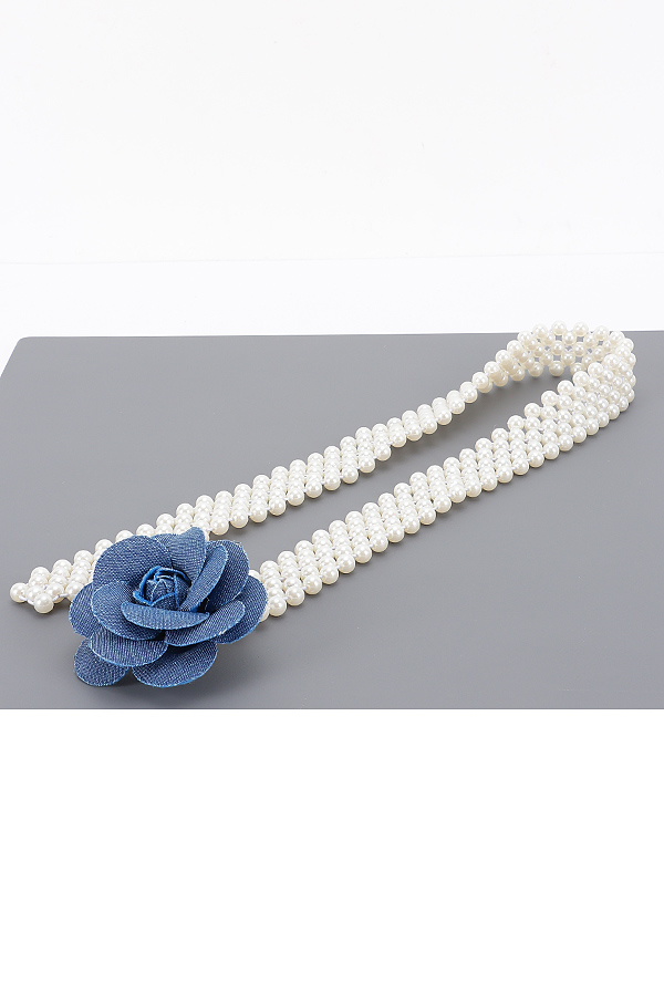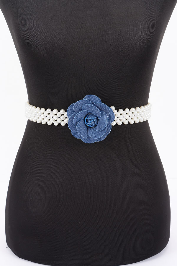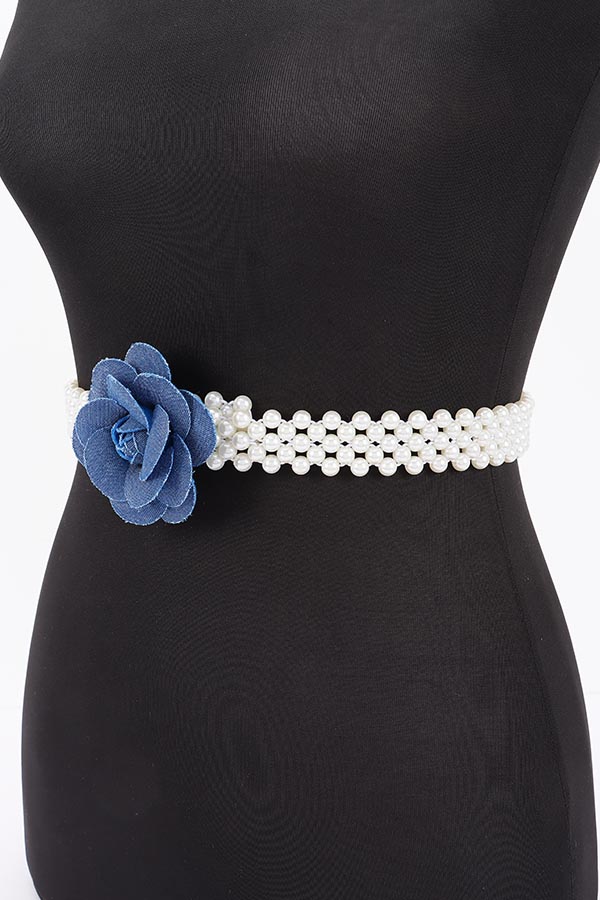 - * Faux Pearl Denim Flower Buckle Stretch Belt