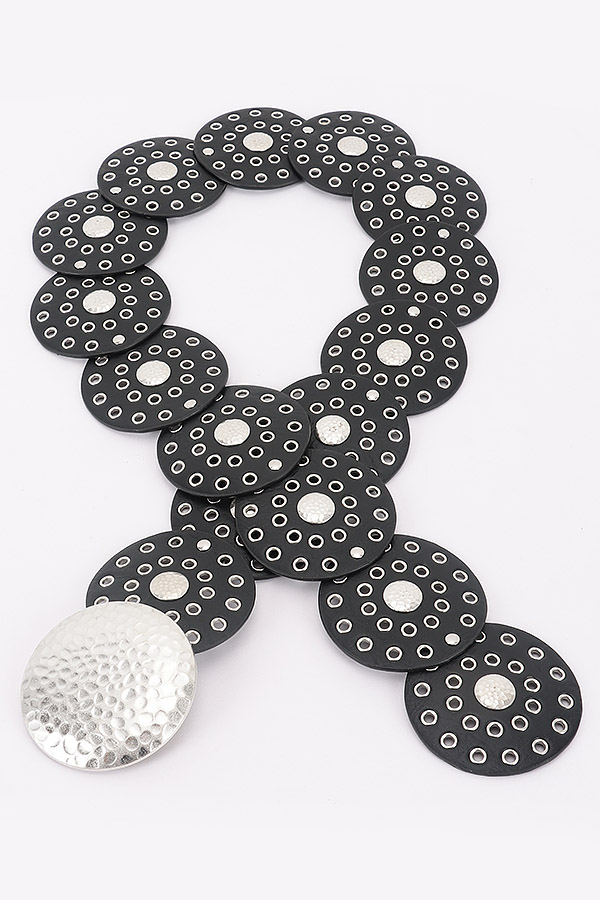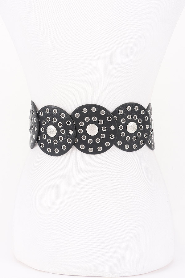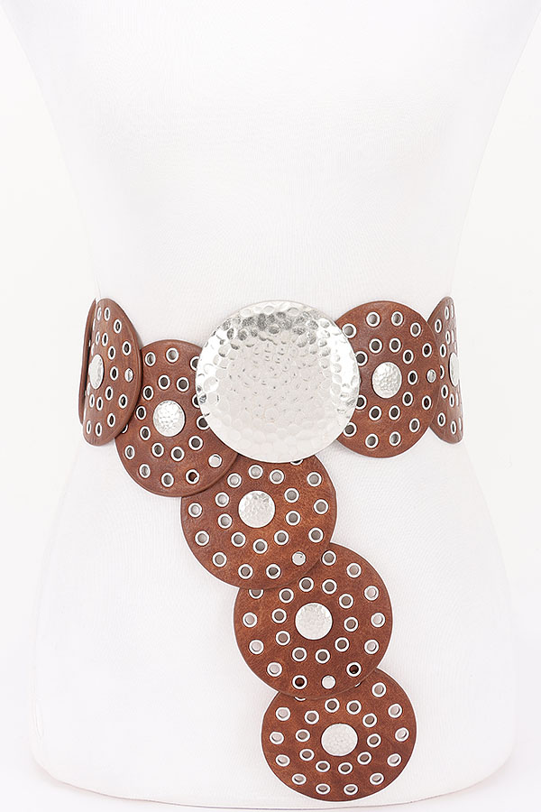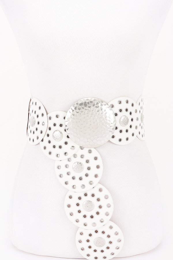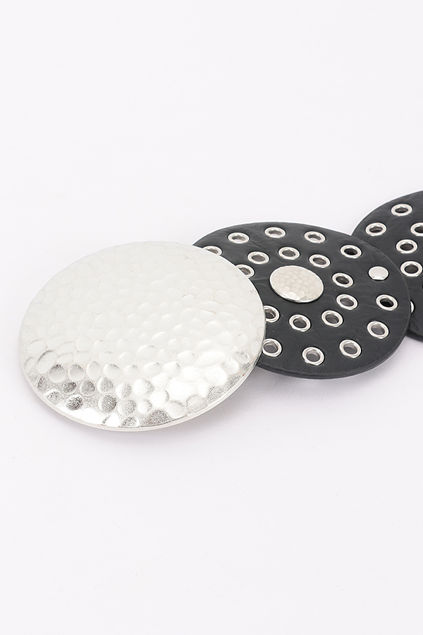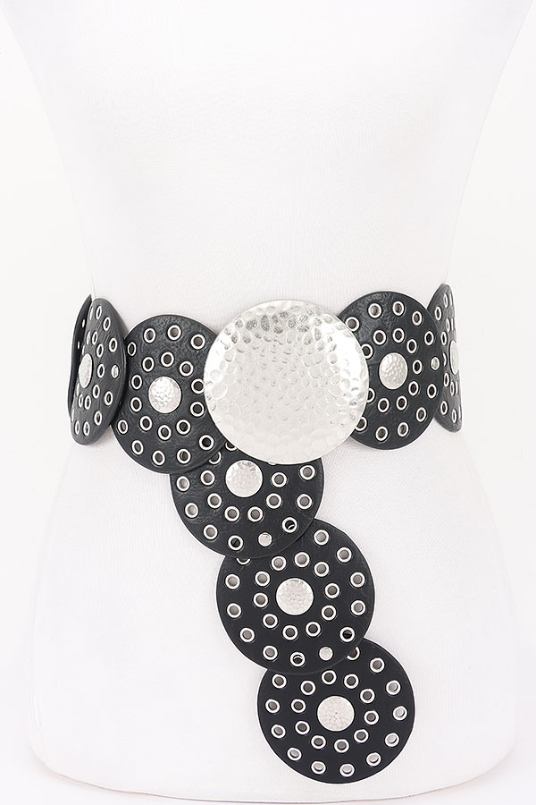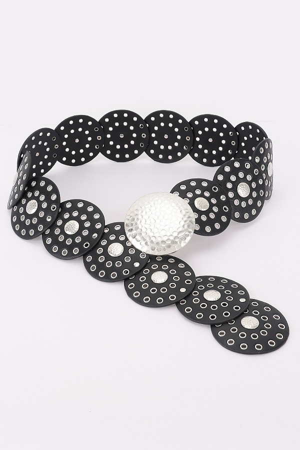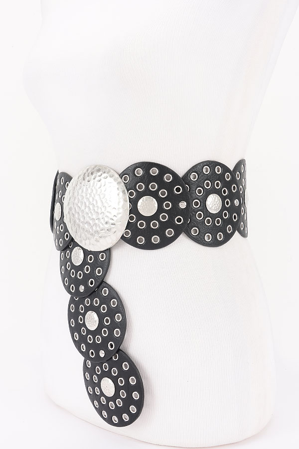 - * This Statement Disc Belt from H&D Accessories features an eye - catching design with large circular discs and metallic accents. The belt has a bold and unique look, perfect for adding a dramatic touch to various outfits.