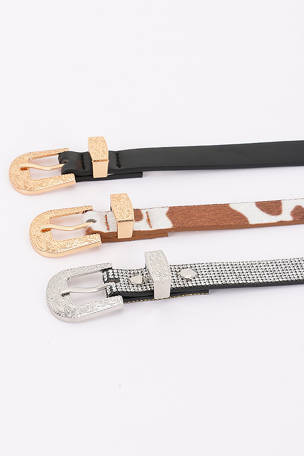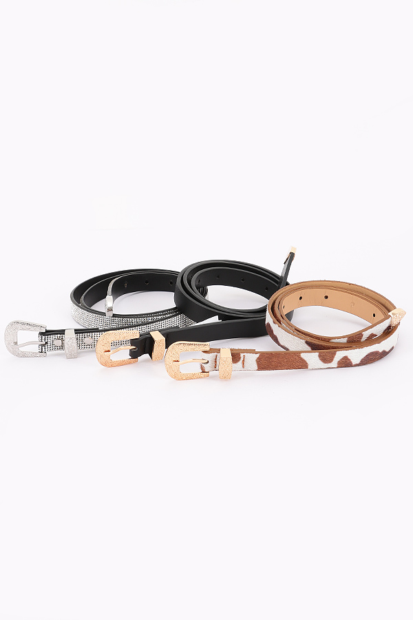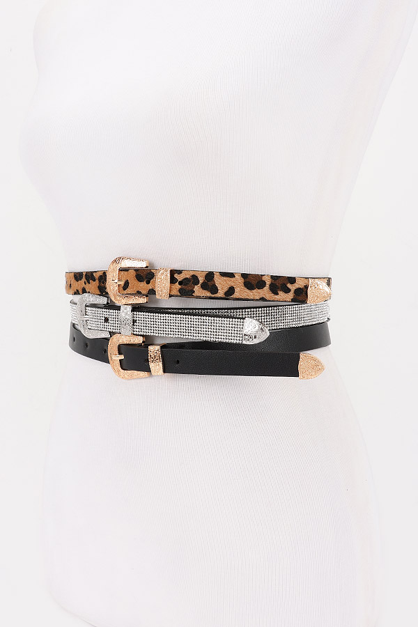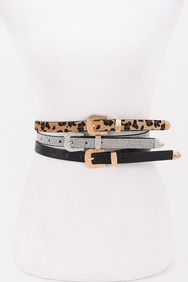 - * This is a set of three belts from H&D Accessories. Each belt has a unique design: one with a leopard print, one with a rhinestone - encrusted look, and one in a solid color, all featuring classic buckle closures. The variety in styles makes them versatile for different outfits.