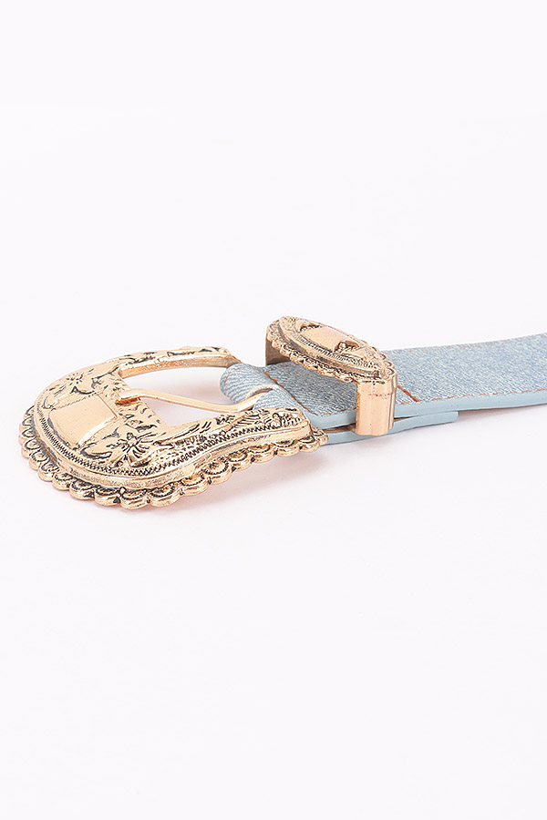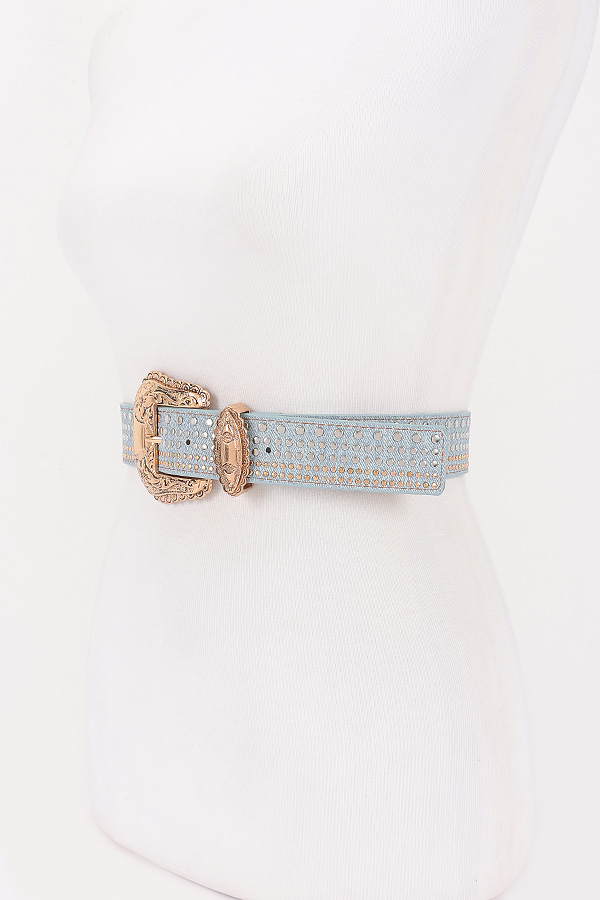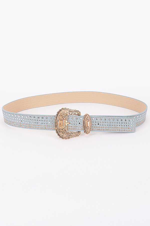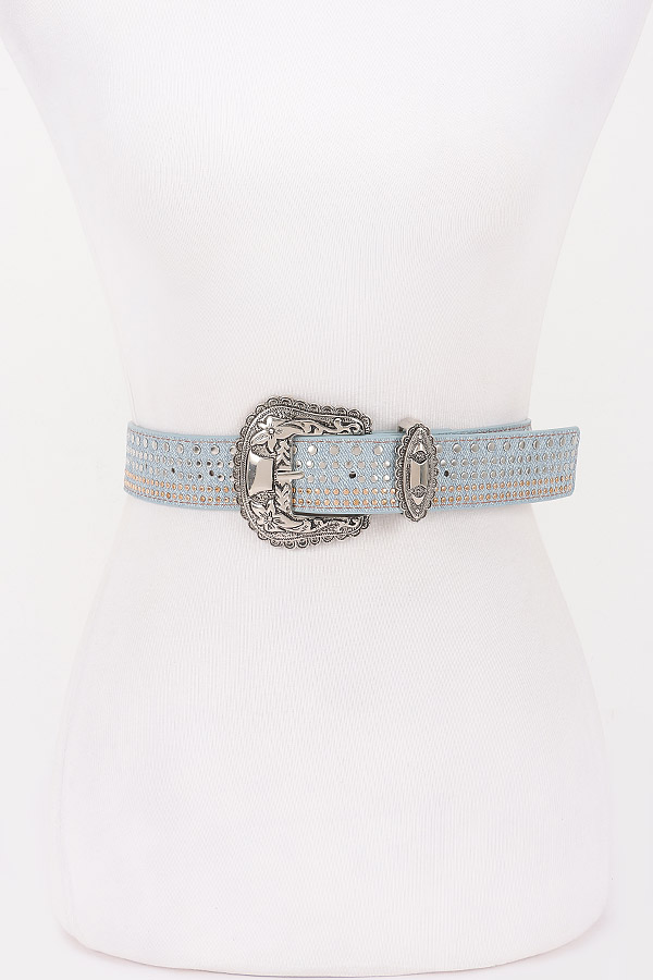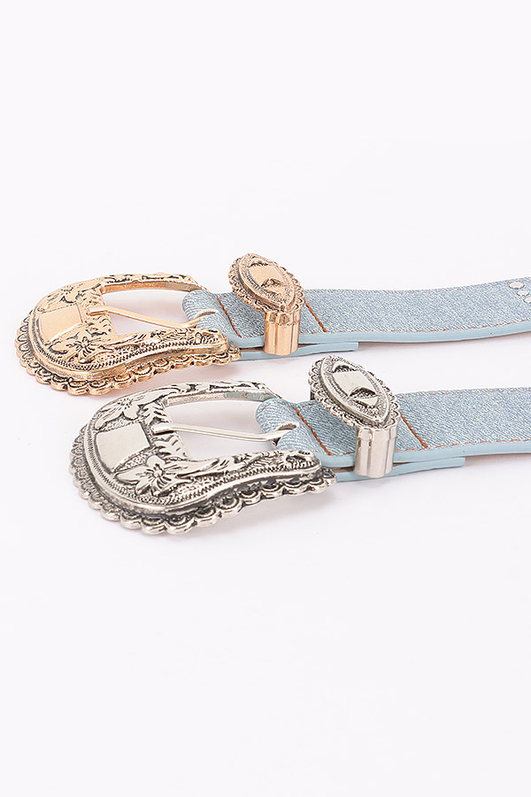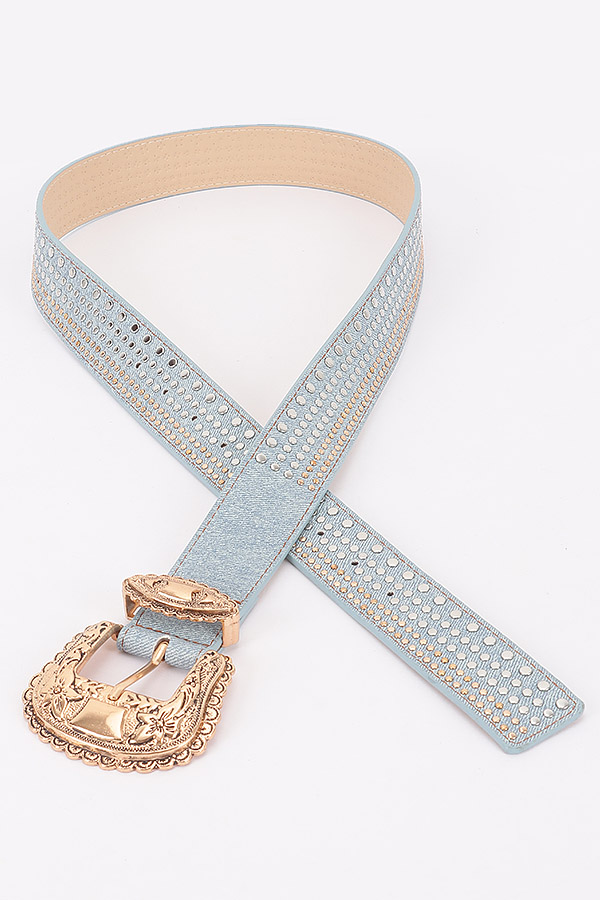 • * This Denim Metal Studded Western Belt from H&D Accessories features a classic western - style design with a decorative metal buckle and metal stud embellishments on the denim strap. The belt has a rugged yet stylish look, perfect for adding a western flair to various outfits.