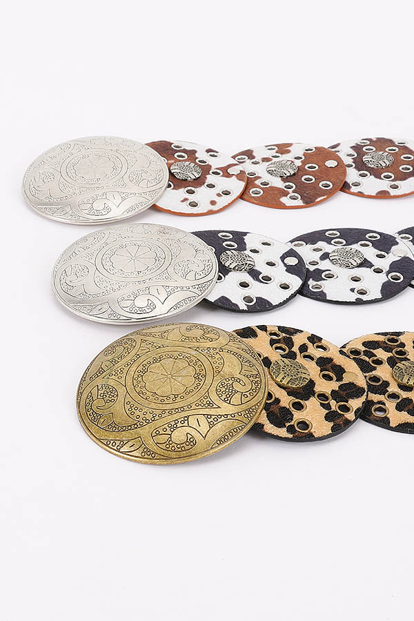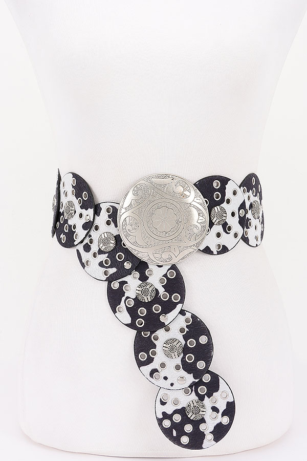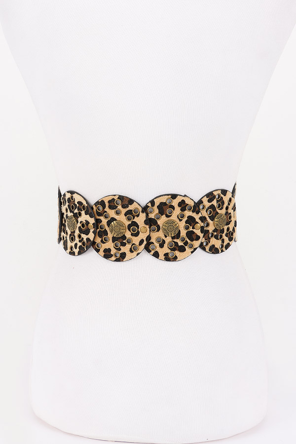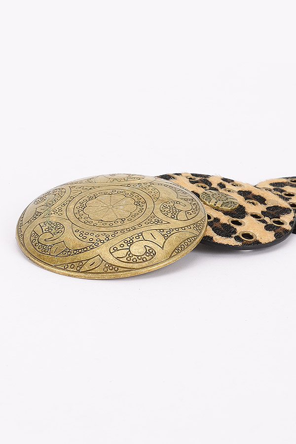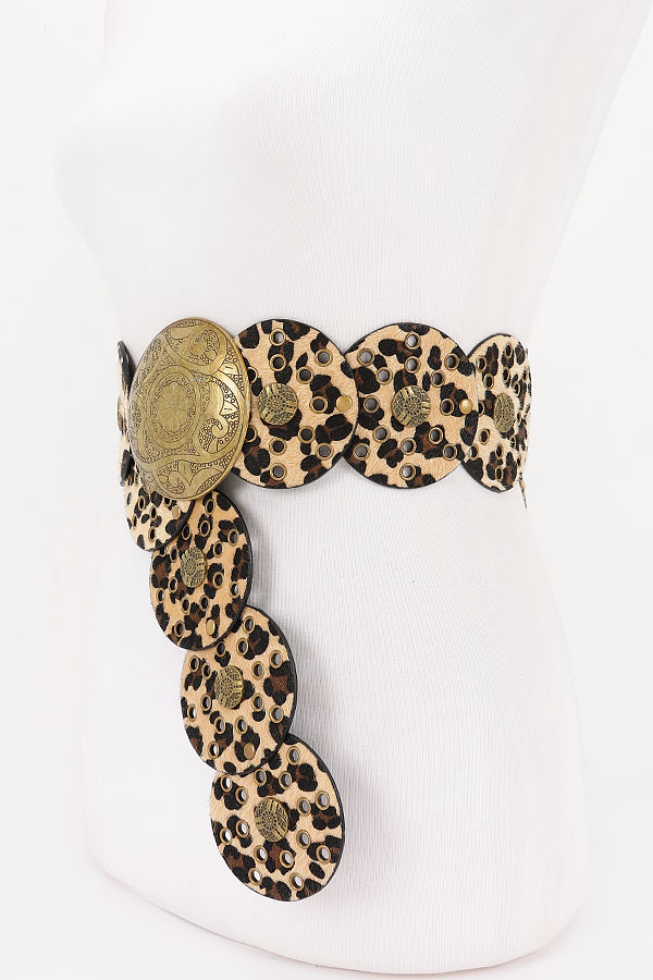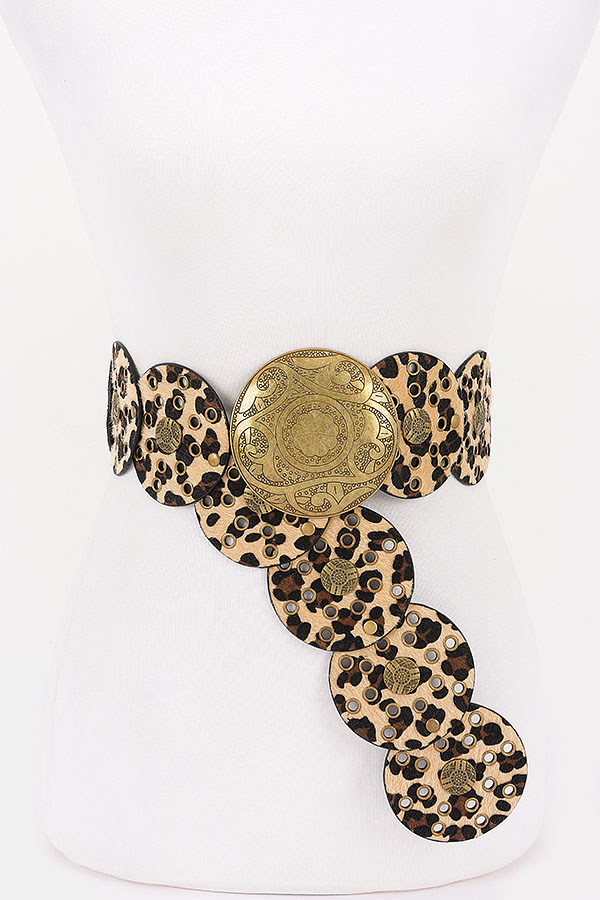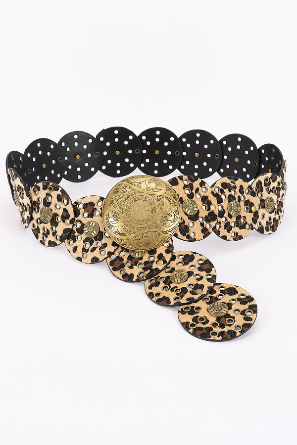 - * This Metal Buckle Faux Leather Belt from H&D Accessories has a bold, statement - making design. It features circular, leopard - print faux leather panels adorned with metal studs and a large, ornate metal buckle at the center. The unique, eye - catching style adds a dramatic touch to outfits.