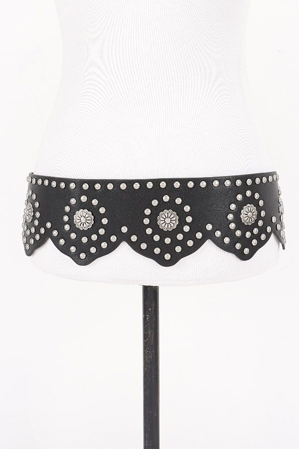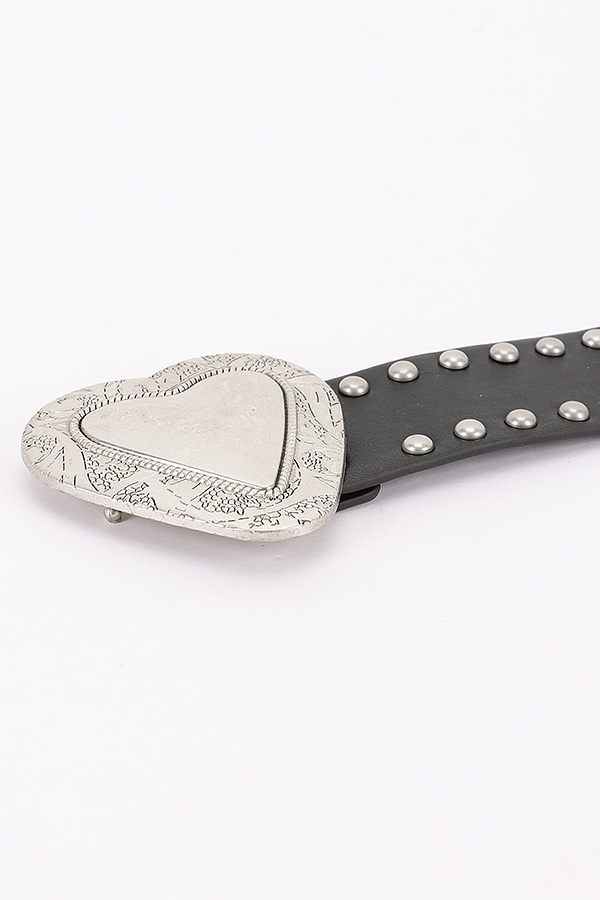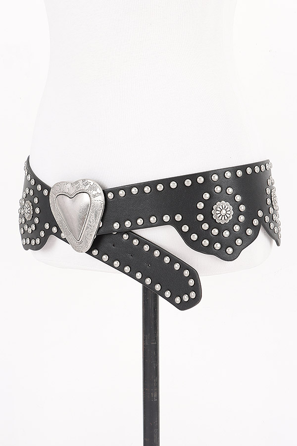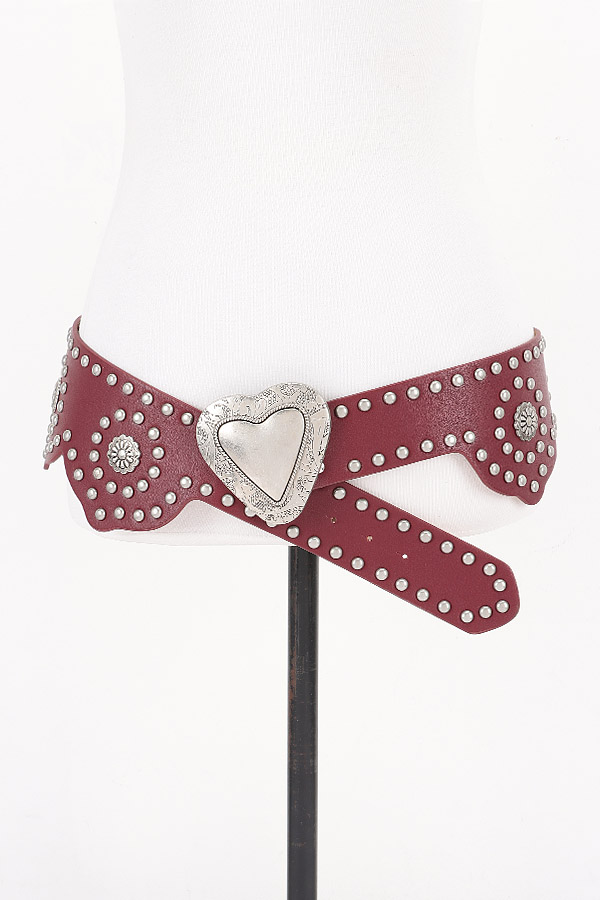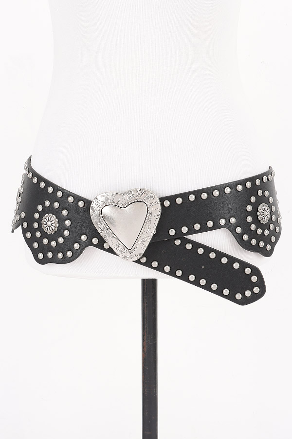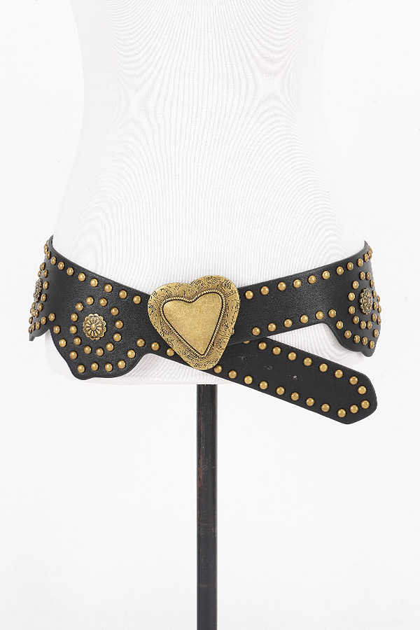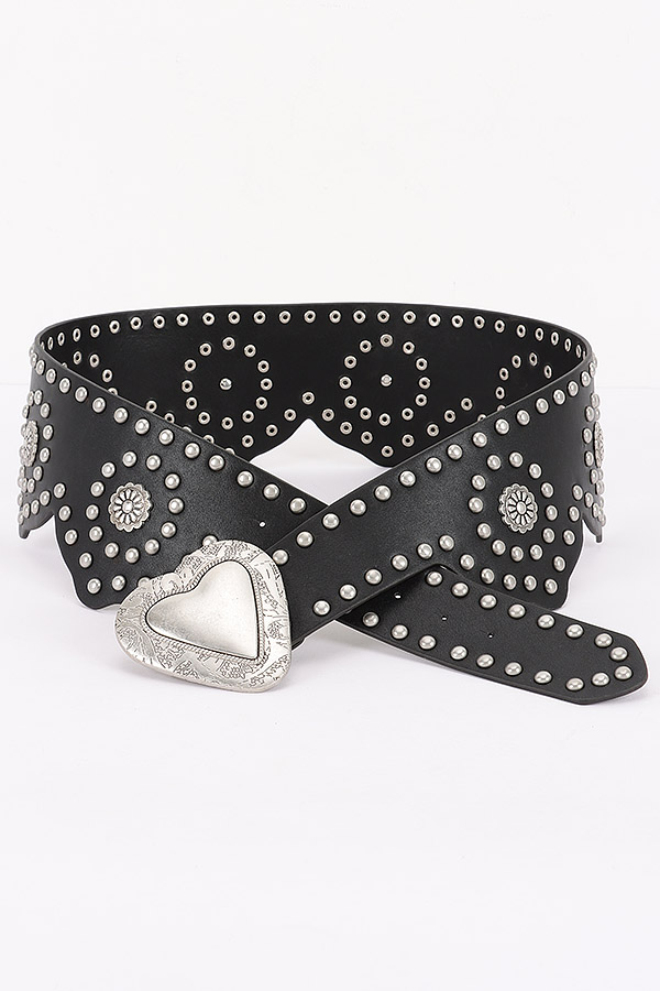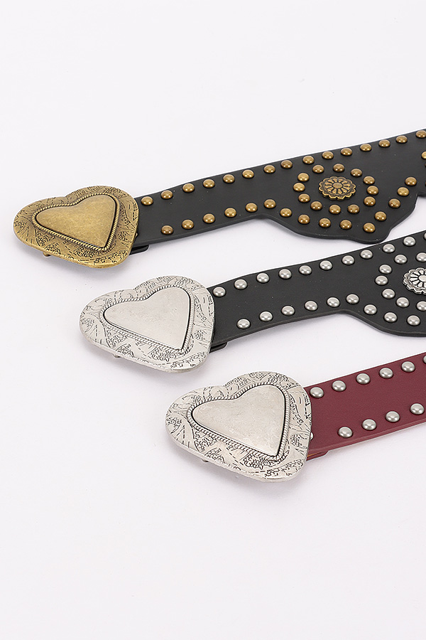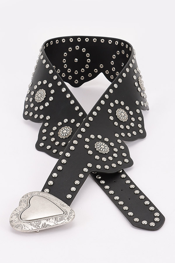 - * Faux Leather Metal Studded Belt from H&D Accessories features an eye-catching design with abundant metal studs and a decorative floral stud pattern. It is equipped with a heart-shaped buckle adorned with intricate carvings, adding a distinctive vintage vibe. The faux leather construction ensures durability while offering a sleek look. Ideal for elevating outfits like denim jeans, boho dresses, or festival ensembles, this belt brings a touch of edgy charm to your style.
