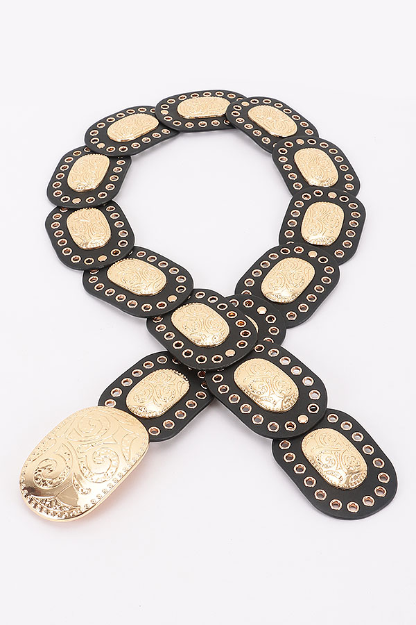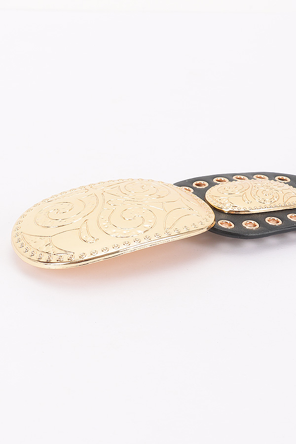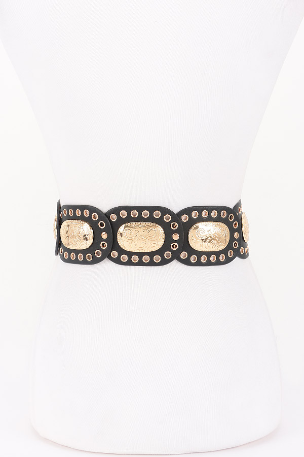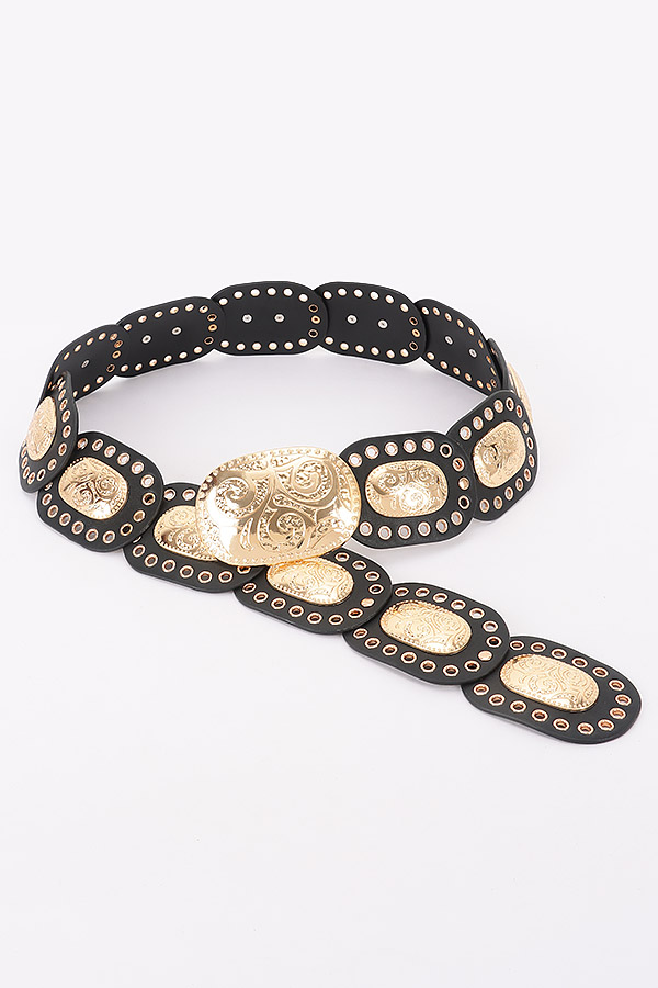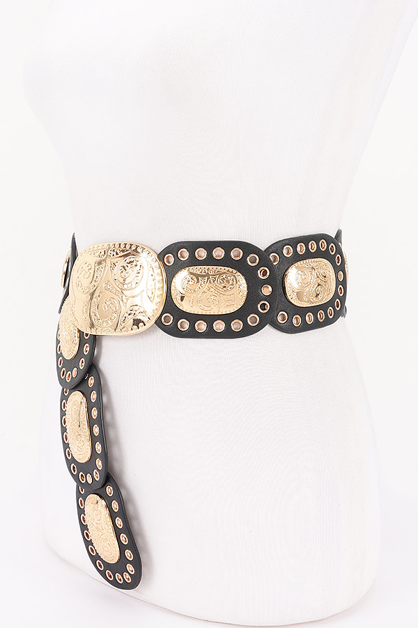 • * This is a Faux Leather Multi Metal Eyelet Disc Belt from H&D Accessories. It features a strap made of smooth faux leather, adorned with interconnected oval discs. Each disc has intricate metal eyelets and engraved metal plates with decorative patterns. The center showcases a large, ornate metal buckle. Adjustable for a secure fit, it blends bold hardware with structured faux leather. Ideal for enhancing bohemian, western, or retro - styled outfits, it suits music festivals, themed parties, or nights out. Pair it with flowy dresses, high - waisted jeans, or midi skirts for a standout look with an artisanal touch.