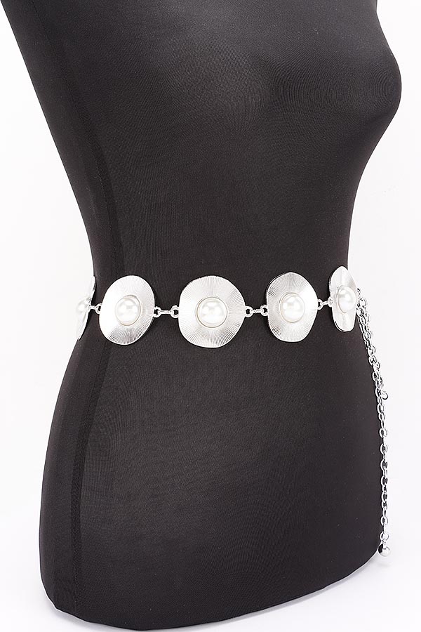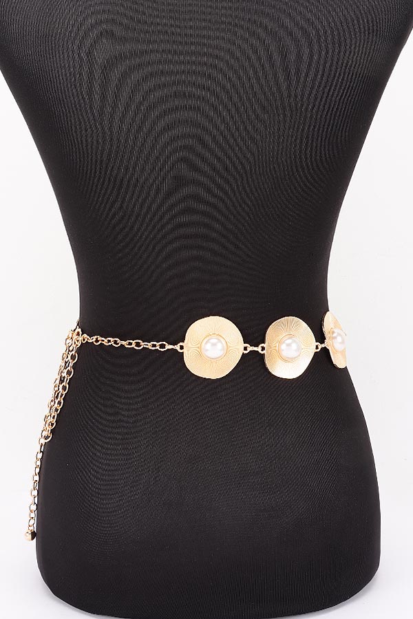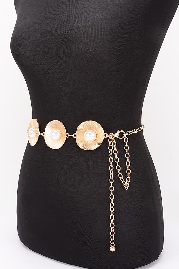 - * This Pearl Accent Disc Chain Belt from H&D Accessories features a design with circular discs adorned with pearl accents, connected by a chain. It has an elegant and sophisticated appearance, giving off a chic and glamorous vibe.Ideal for complementing evening gowns or cocktail dresses at events like galas, weddings, or award ceremonies, adding a touch of luxury and elegance.
