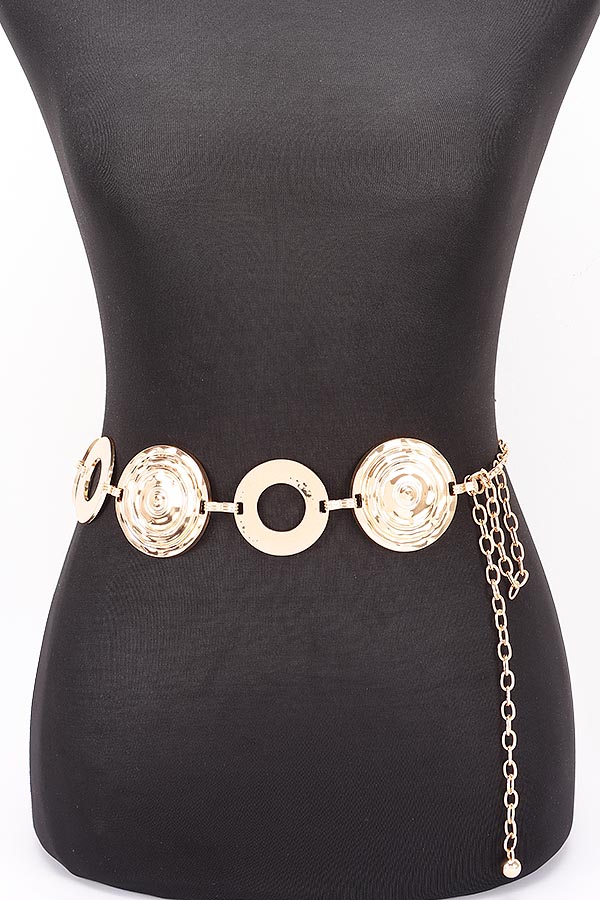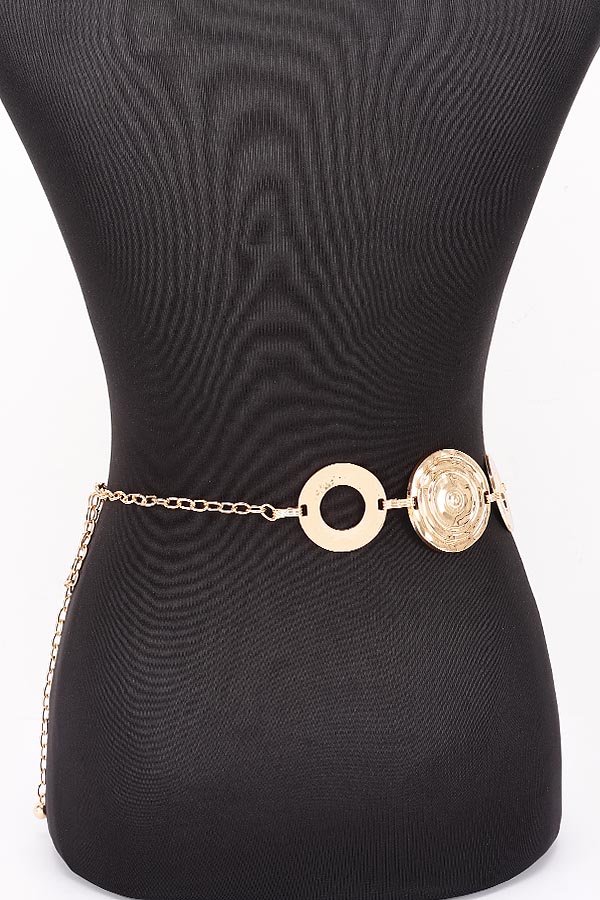 - * This is a statement waist chain from H&D Accessories, featuring a series of distinctive circular links with textured and hollow designs, complemented by a cascading chain detail on one side. It can be styled to elevate a simple dress for a night out or add an edgy touch to a crop top and high-waisted pants ensemble, making it a standout piece for parties, fashion events, or any occasion where you want to make a bold fashion statement.