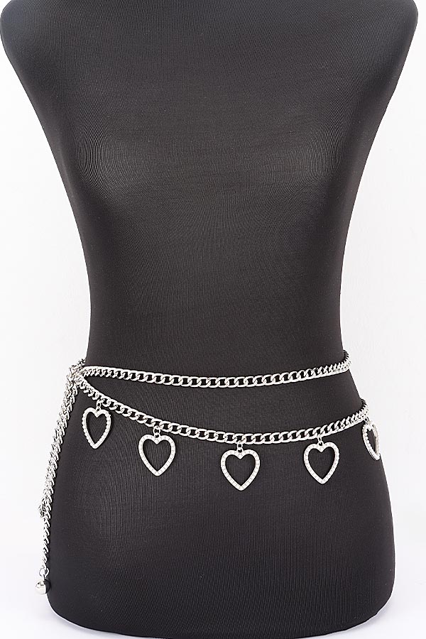 - * The Layered Heart Charm Adjustable Waist Chain Belt from H&D Accessories features a double-layered design, with a fine chain forming the top layer and a longer, decorative layer that dangles open heart charms for a playful, romantic touch. The adjustable extension chain ensures a secure, personalized fit, making it ideal for adding a flirty accent to a cropped top and high-waisted jeans combo for a day out with friends, cinching the waist of a flowy sundress for a picnic, or elevating a sleek bodysuit for a night on the town. Whether you’re going for a casual, everyday look or a fun, statement-making ensemble, this versatile waist chain belt effortlessly blends sweet, feminine details with modern styling to become a must-have accessory in your collection.