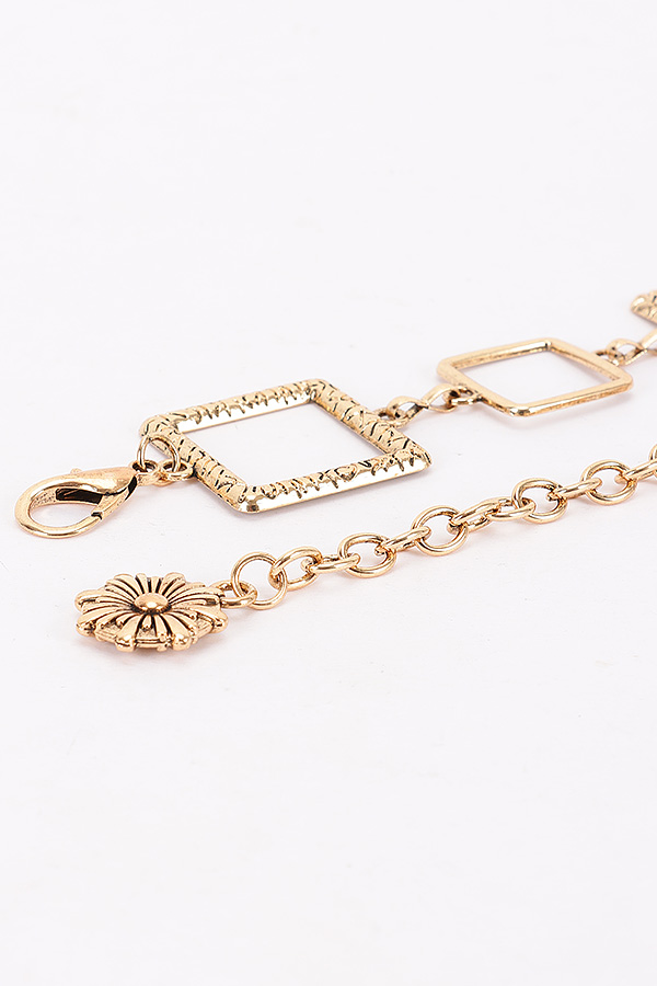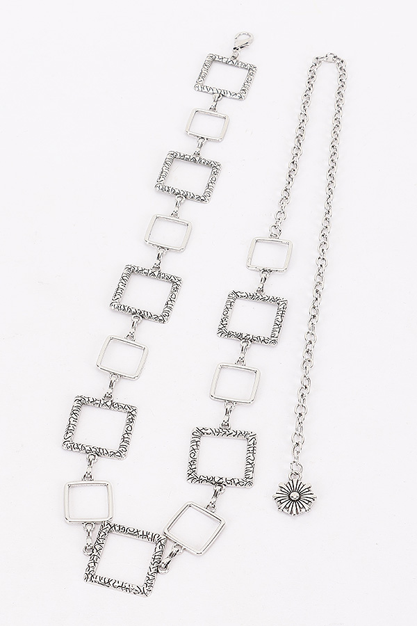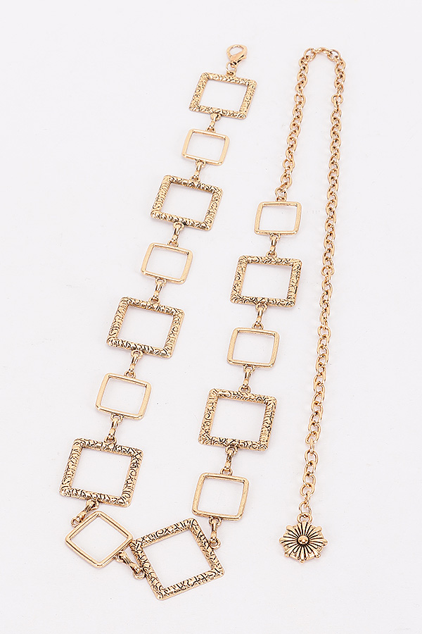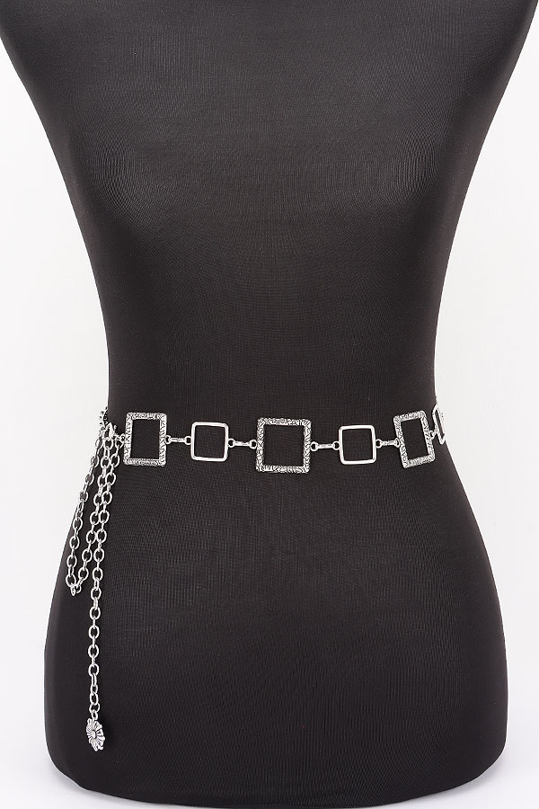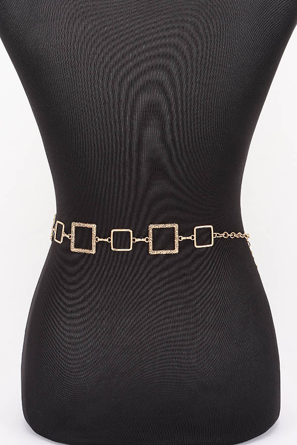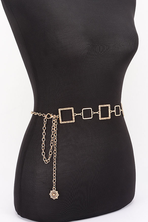 - * This is a Chain Belt from H&D Accessories, composed of decorative openwork square links: each square features an intricate, textured border pattern, with alternating subtle variations in the frame’s detailing for visual depth. The belt also includes a sleek extension chain finished with a sunburst-shaped accent. It’s perfect for adding a polished touch to a flowy dress for weekend brunch, cinching a loose blouse for a casual outing, or elevating an evening look—each decorative element blends style with waist-defining functionality.