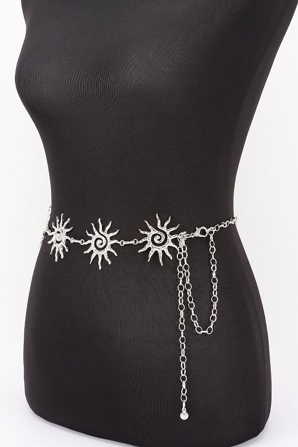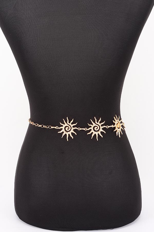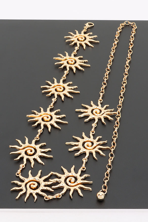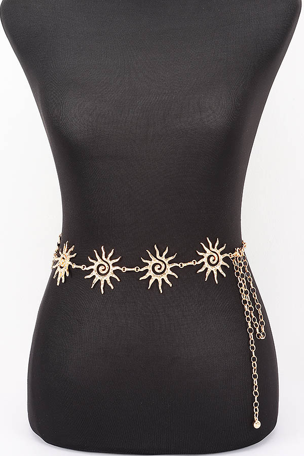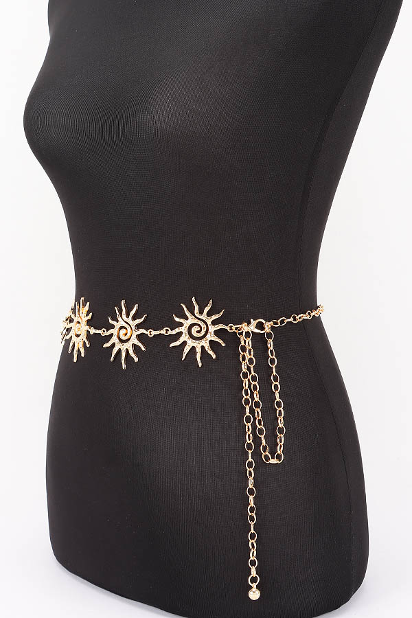 • * This is a Vintage Chain Belt from H&D Accessories, adorned with sun-shaped decorative links: each sun features pointed, radiating rays and a swirling spiral center, with textured detailing that adds dimensional charm. The links connect smoothly, paired with an adjustable chain extension finished with a small spherical accent. It’s ideal for adding a whimsical, retro touch to a flowy sundress for weekend brunch, cinching a loose blouse for a casual outing, or elevating an evening look—each sun decoration blends playful style with waist-defining functionality.
