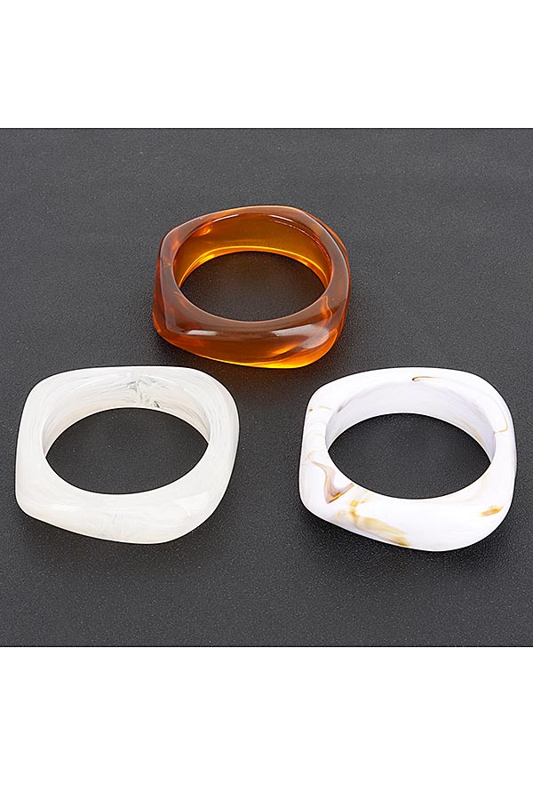 - * Unveil the "3pack Resin Bangle" – a chic pack of three resin bangles featuring a harmonious mix of amber and white. Designed by H&D Accessories, this set is perfect for those who appreciate unique and eye-catching accessories that make a statement.