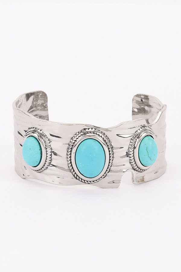 - * This is a Turquoise Bracelet from H&D Accessories. It features a cuff - style design with a textured, hammered - metal finish. Three turquoise stones, each framed by decorative twisted - metal borders, are set across the front. The open - cuff structure allows for easy wear and adjustable fitting. Ideal for adding a touch of bohemian or Southwestern flair to outfits, it suits casual outings like music festivals, beach trips, or pairing with denim and flowy tops for a laid - back yet stylish look.
