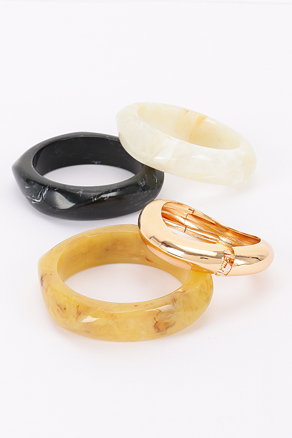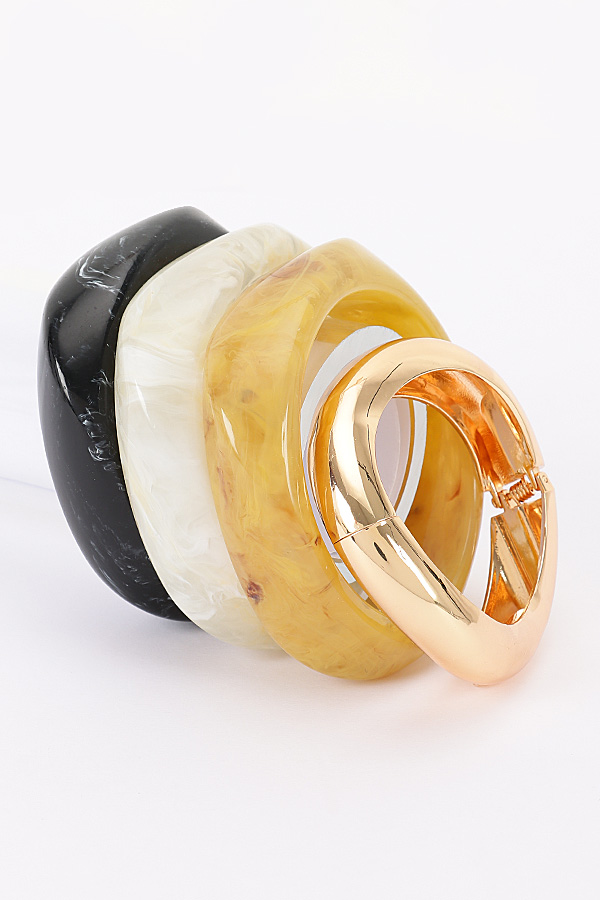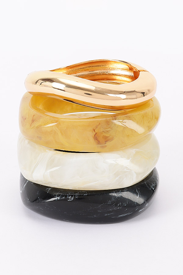 - * This Multi Mixed - Material Bracelet from H&D Accessories combines smooth resin and sleek metal textures, offering both subtle organic marbling and a refined shine. Ideal for casual brunch dates or office days, the set can be stacked for a bold look or worn individually for understated style, making it a versatile addition to any accessory collection that transitions easily from day to night.