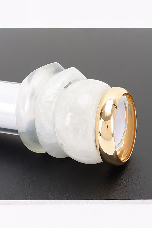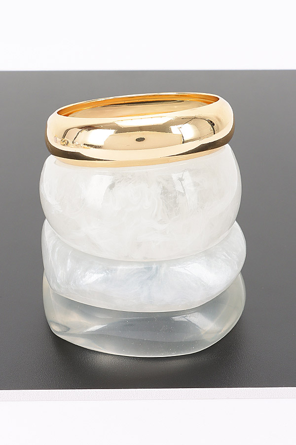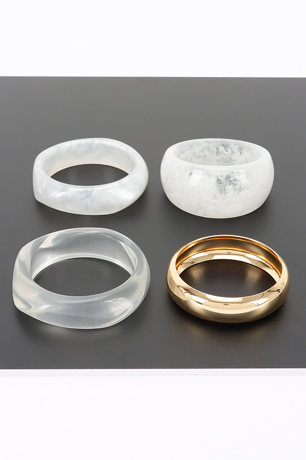 • * This Multi Mixed - Material Bracelet from H&D Accessories features a curated selection of styles, including a slim, smooth resin bracelet with a subtle, organic marbled pattern, a wide, opaque resin bracelet with a cloud-like texture, a fluid, twisted resin bracelet that catches light with its curved surface, and a polished metal bracelet with a sleek, rounded edge that adds a touch of refined shine. Perfect for elevating your look during a casual lunch with friends or a day of running errands, this versatile set can be stacked together for a bold, layered statement or worn individually to complement any outfit, offering endless ways to express your personal style.
