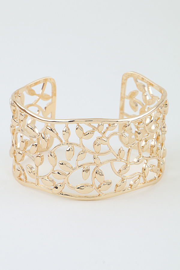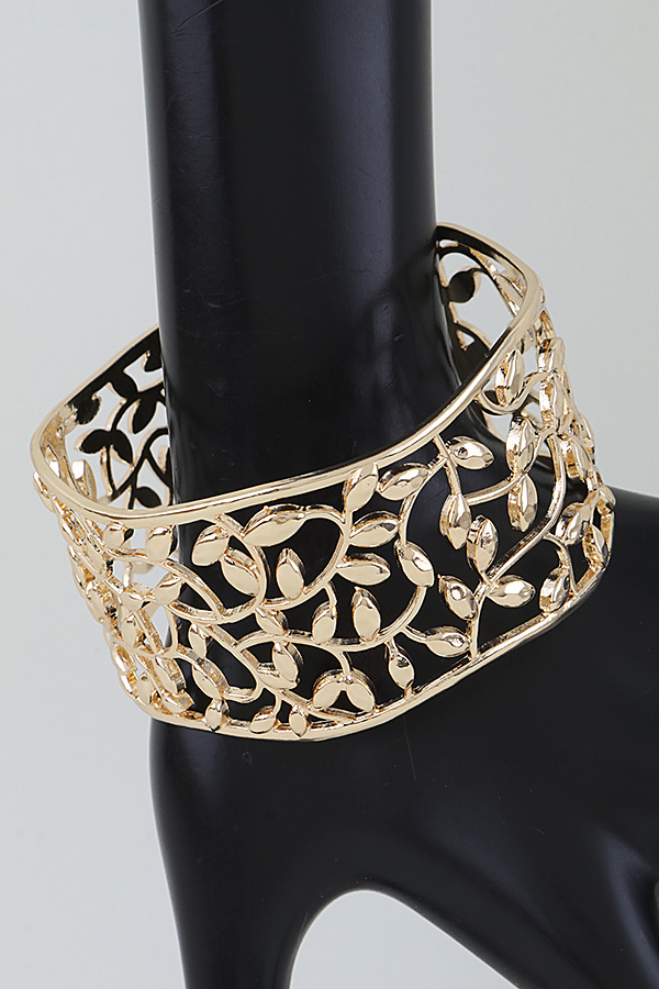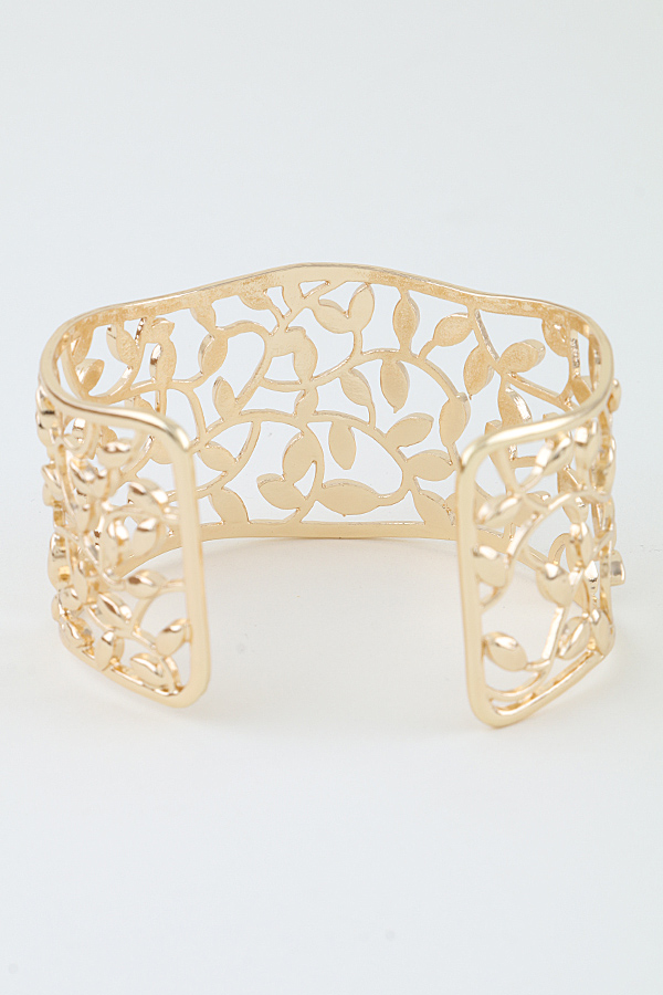 - * Polished Nature Vine Cuff Bracelet from H&D Accessories showcases an intricate openwork design of interwoven vines and delicate leaves, crafted with a smooth, polished finish for a luxurious look. Its wide cuff shape offers a comfortable adjustable fit, making it an ideal statement accessory to elevate evening galas, cocktail parties, or chic daytime gatherings.