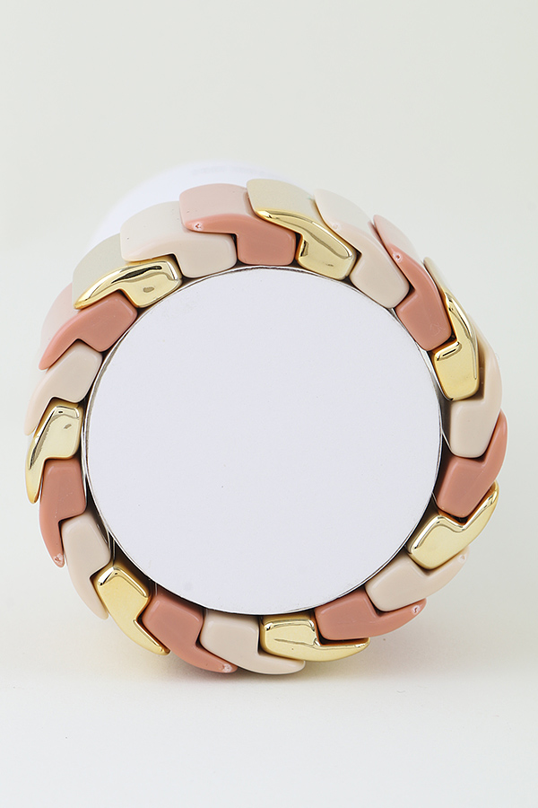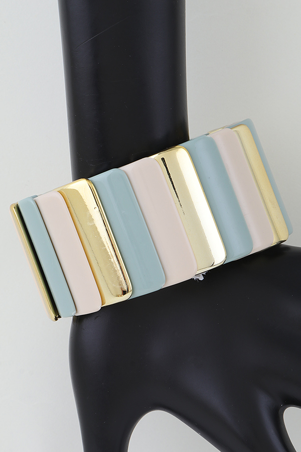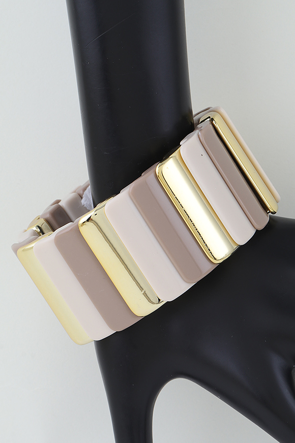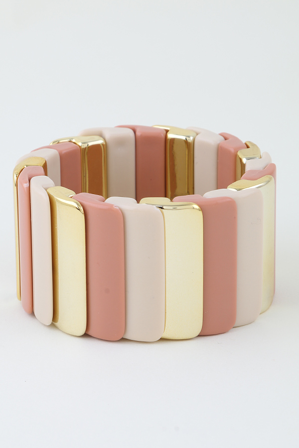 - * The Textured Resin Segmented Bangle from H&D Accessories features a series of uniform rectangular blocks, each showcasing a subtle ridged texture that provides a tactile feel. The segments are connected to form a cylindrical, stretchable bracelet, with polished metallic edges framing each piece for a refined contrast between the matte resin and the gleaming accents. Its clean, architectural design offers a modern and structured aesthetic. This versatile piece effortlessly transitions from day to night. It adds a sophisticated, contemporary accent to a casual daytime outfit like a knit sweater and trousers, and elegantly complements a minimalist evening ensemble for a dinner or social gathering.