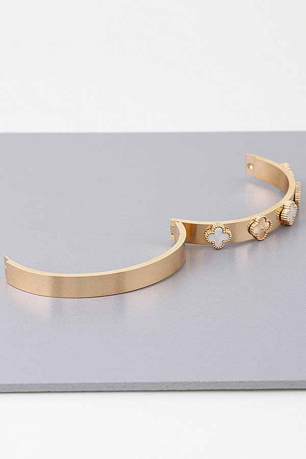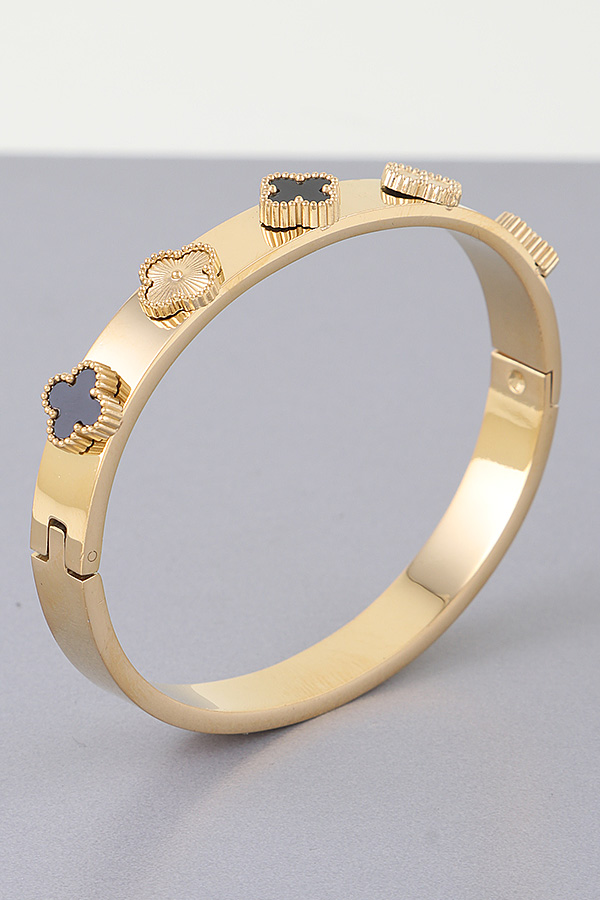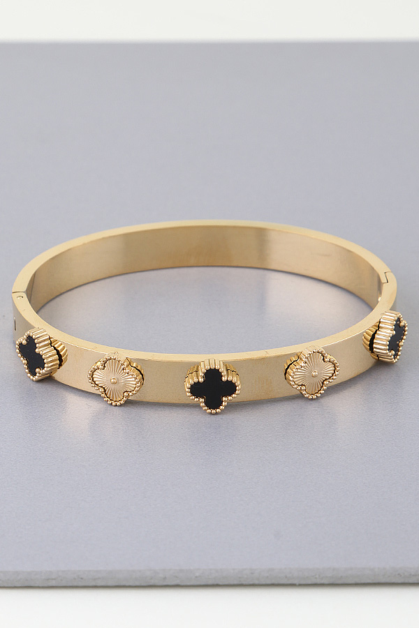 • * Discover the "Multi Clover Charm Band Bracelet" – where timeless elegance meets contemporary design. This beautiful bracelet showcases a radiant gold finish complemented by bold black clover, making it a must-have for any jewelry collection. Embrace the allure of this captivating piece and let it be the statement accessory that enhances your every outfit.