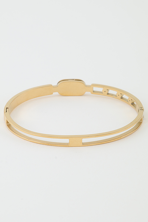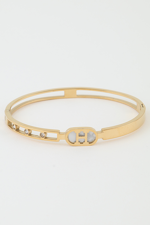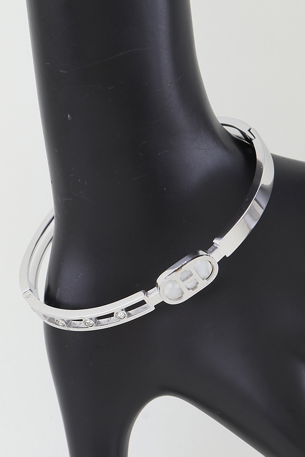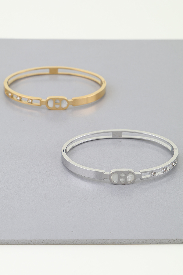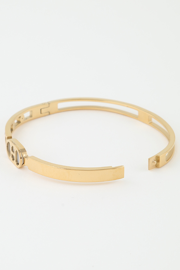 - * This is an Open Jeweled H Cuff Bracelet. It has an open - cuff design. The bracelet features a central oval - shaped decoration with an engraved letter "H". Delicate cut - outs and small jewels adorn the bracelet. From H&D Accessories, it combines a modern, open structure with intricate detailing, showcasing fine craftsmanship.
