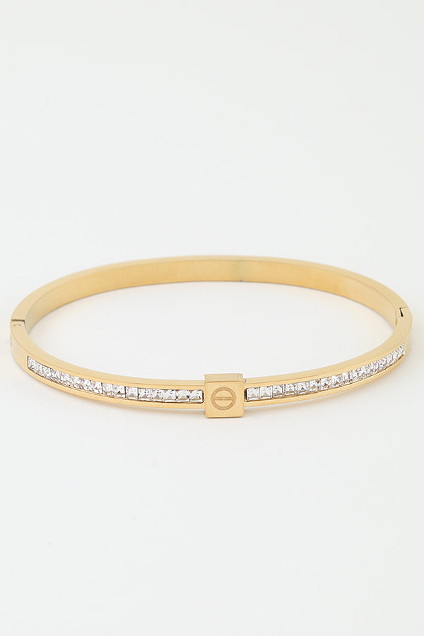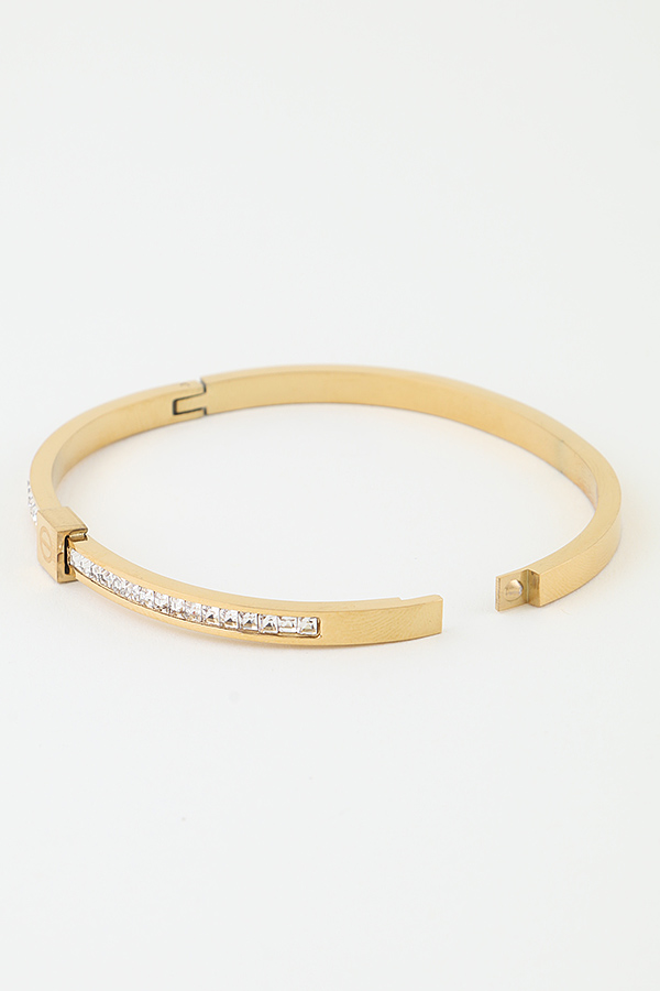 - * This is a Bejeweled Rhinestone Cuff Bracelet. It has a sleek, circular cuff shape. A row of rhinestones is embedded along part of the bracelet, and there's a distinctive central clasp design. From H&D Accessories, it combines an elegant, minimalist structure with sparkling rhinestones, showcasing fine craftsmanship.