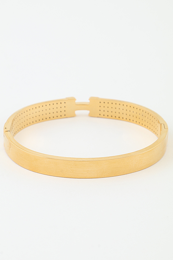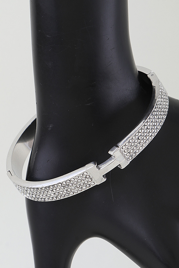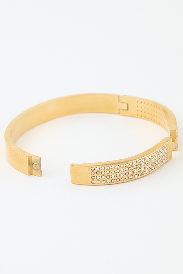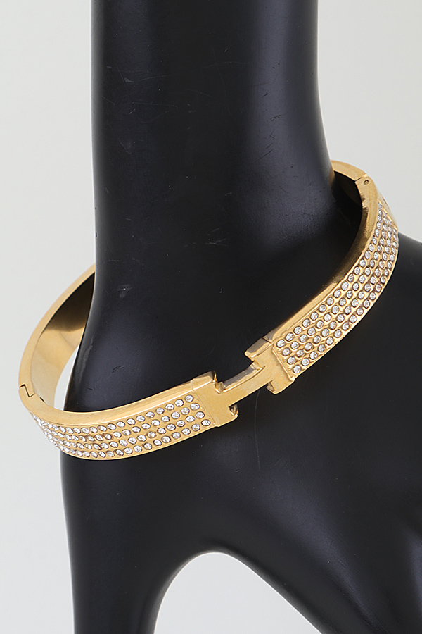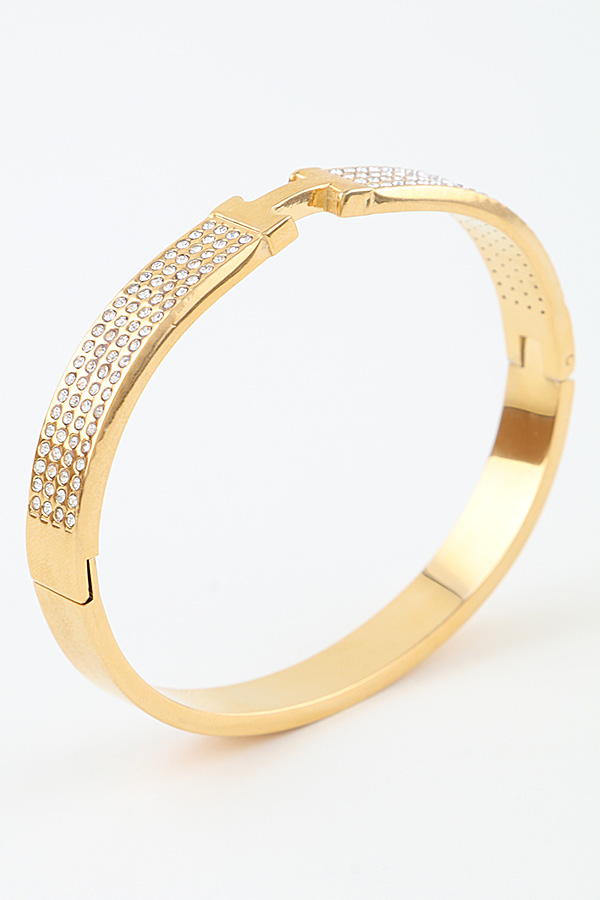 • * This is the Bejeweled H Cuff Bracelet from H&D Accessories. It’s a sleek, open cuff designed with a polished band, featuring two segmented sections encrusted with small, densely set stones for a gleaming effect. The central clasp is shaped into an "H" detail, blending functional closure with decorative styling. The cuff’s smooth edges and structured silhouette balance bold sparkle with a refined, modern design.