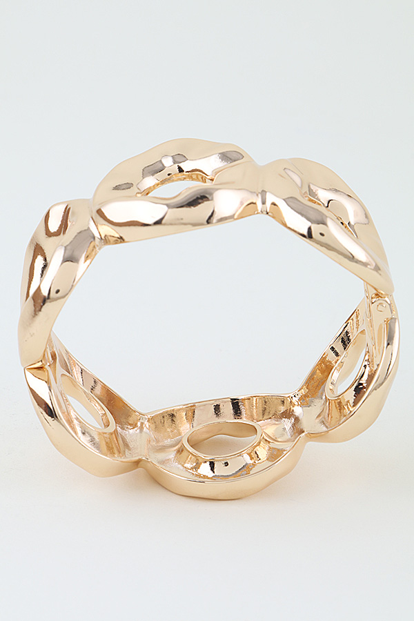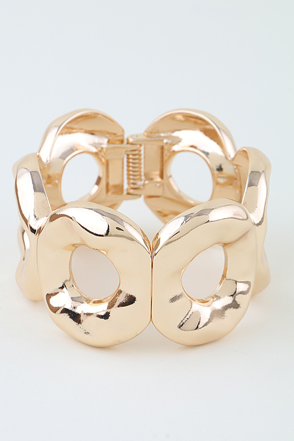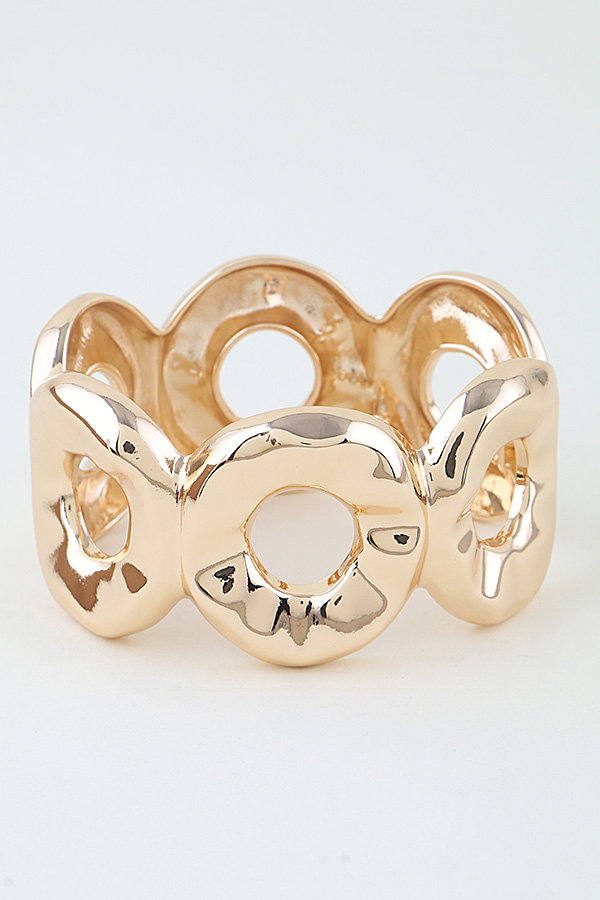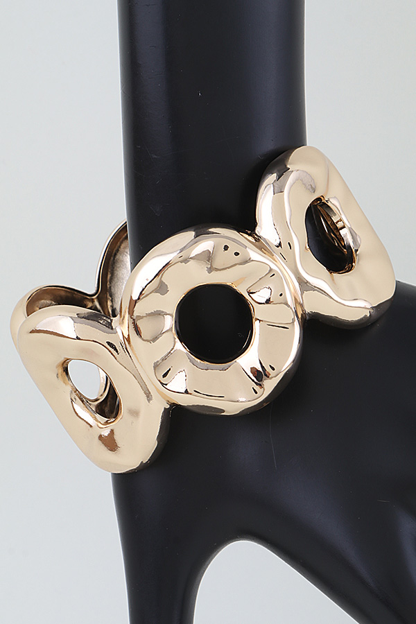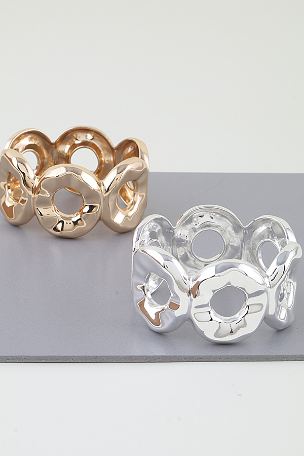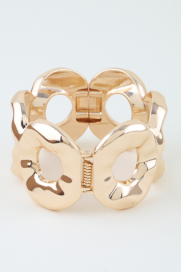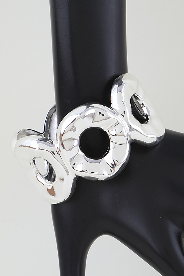 • * This Hammered Disc Loop Cuff Bracelet from H&D Accessories features a bold, sculptural design of interconnected, textured discs, creating a statement silhouette that catches the light with every movement. Its hinged clasp ensures easy, secure wear, making it perfect for elevating evening attire or adding a polished edge to everyday looks. The open-loop detailing balances modern flair with timeless elegance, ideal for both special occasions and casual outings.