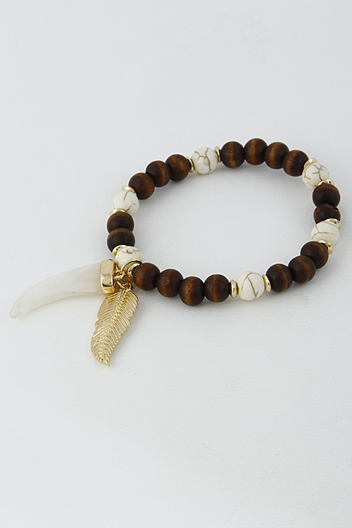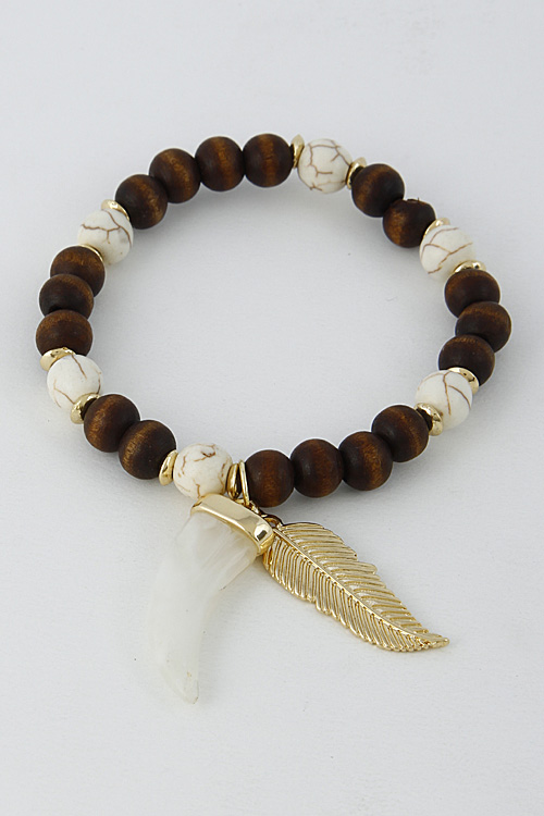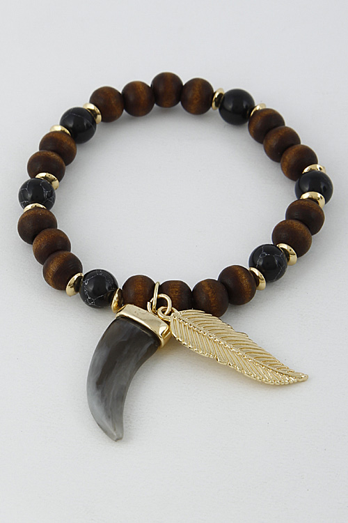 - * Tribal Beaded Bracelet With Leaf And Claw Stone 6BCD8 * 2.5 X 2.5" approx.