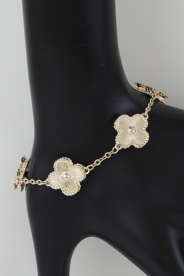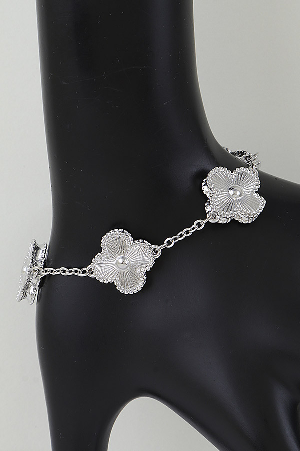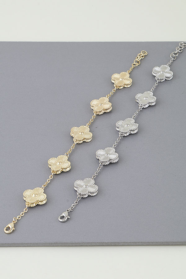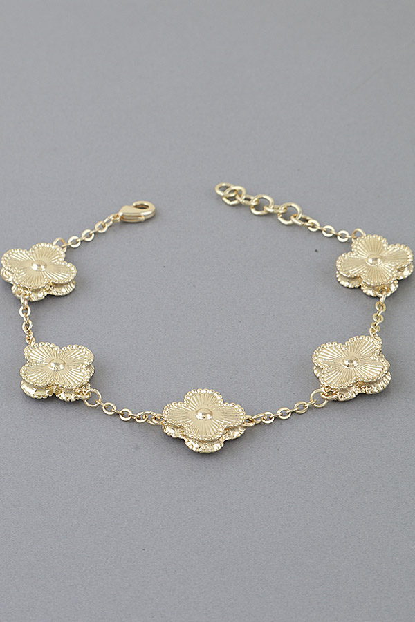 - * Modern Cubic Zirconia Clover Charms Bracelet from H&D Accessories: This features a slender chain strung with layered clover-shaped charms—each detailed with a textured, radiating pattern and a centered spherical accent. The adjustable clasp offers a tailored fit, while the lightweight, sculpted design blends playful charm with sleek minimalism. A versatile piece that merges intricate, dimensional detailing with everyday wearability.