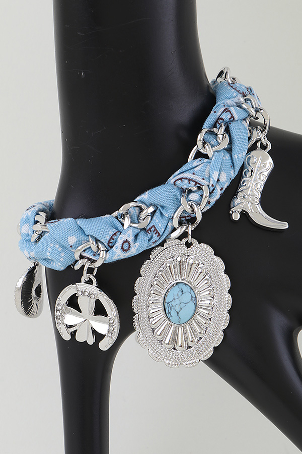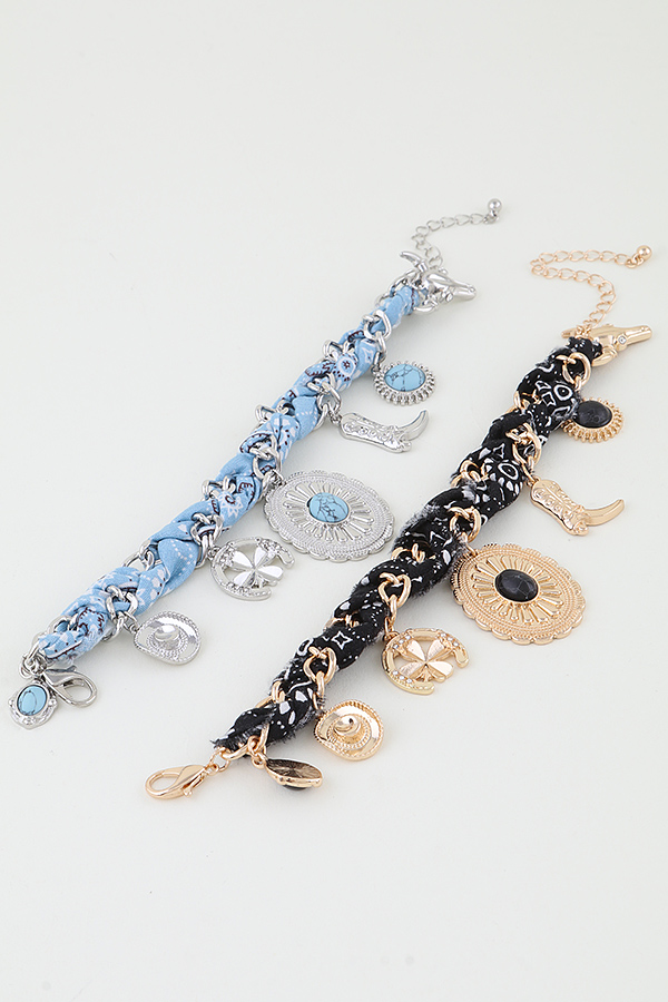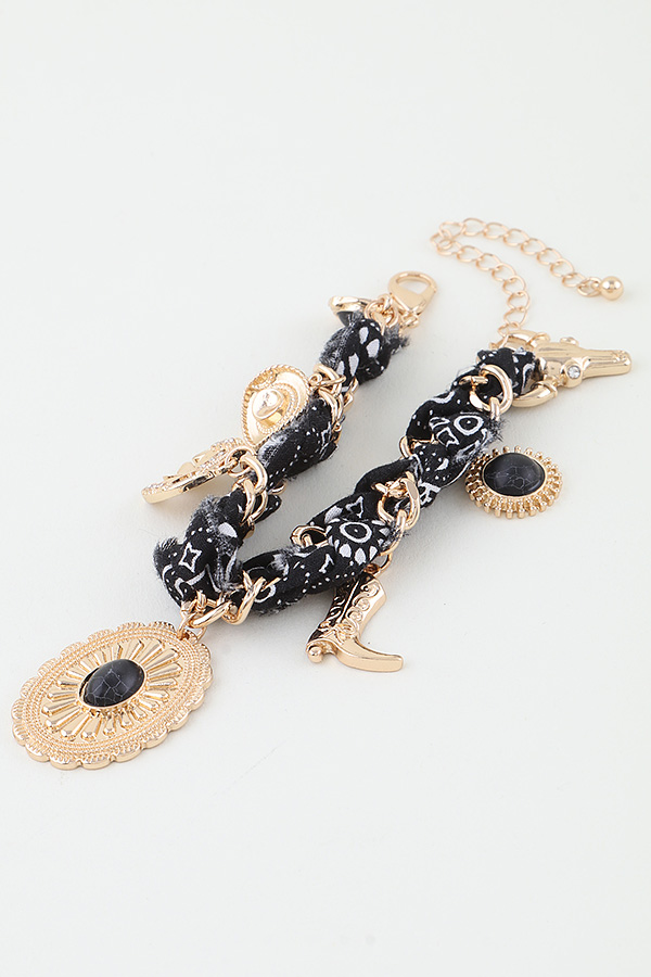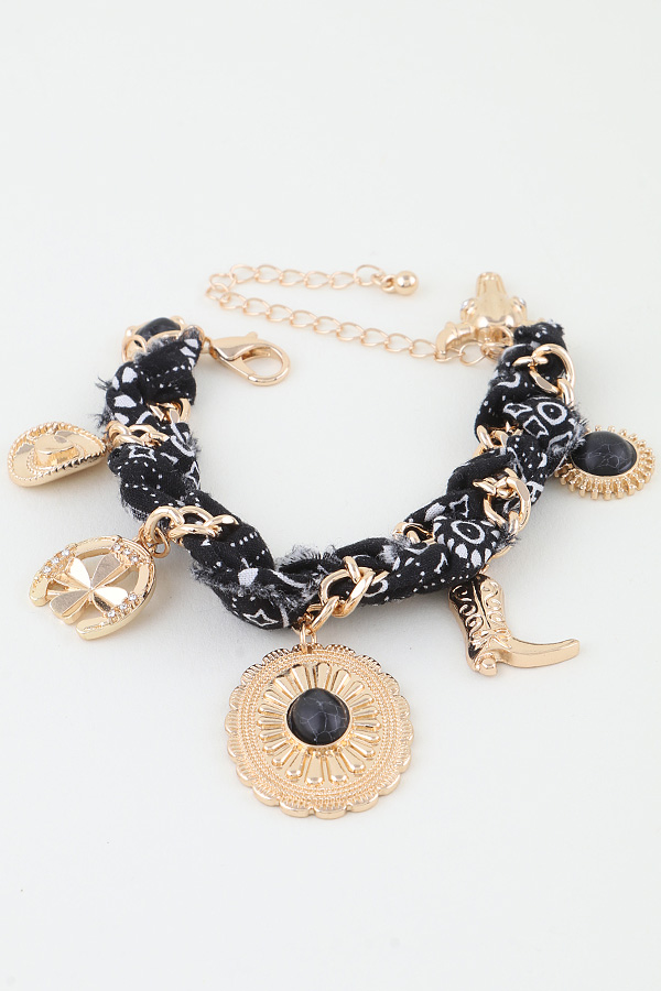 • * This is an Antique Charm Braided Bracelet from H&D Accessories. It features a braided fabric band adorned with multiple unique antique - style charms, including a heart - shaped one, a horseshoe - like charm, and a large circular charm with a decorative center. Perfect for adding a bohemian or vintage touch to casual outfits, like pairing with denim and a simple tee for a laid - back day out, or enhancing the charm of a boho - themed dress for a music festival.