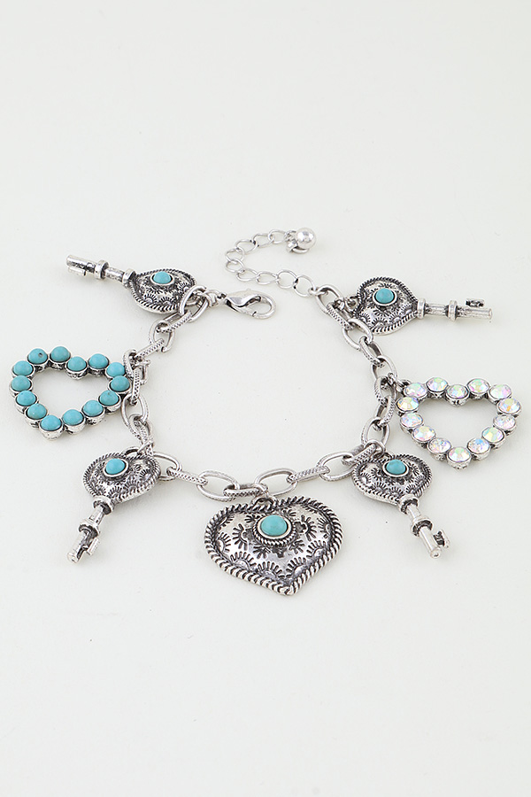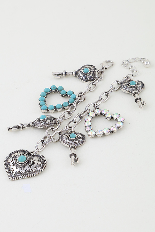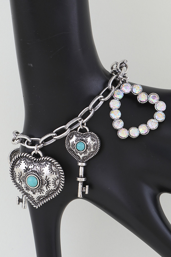 • * These are Key To My Heart Antique Charms Bracelets from H&D Accessories. They feature a delicate chain adorned with antique-style charms, including heart-shaped pendants, keys, and small beaded hearts, each with intricate detailing. Perfect for adding a romantic, vintage-inspired touch to date nights, weddings, or special occasions, symbolizing love and timeless elegance.