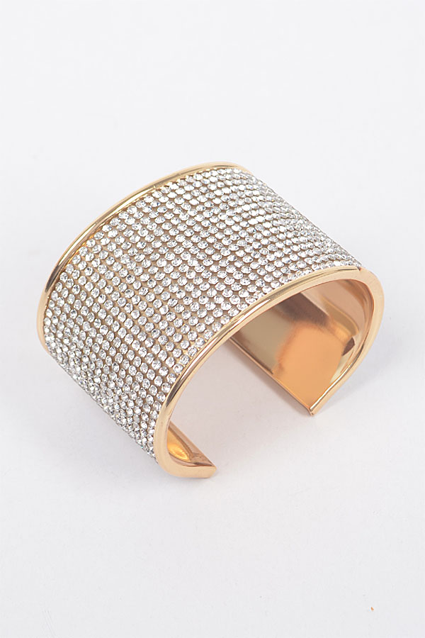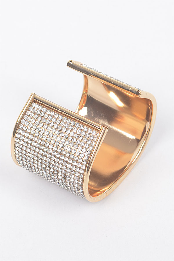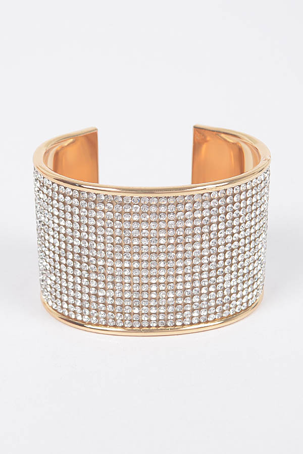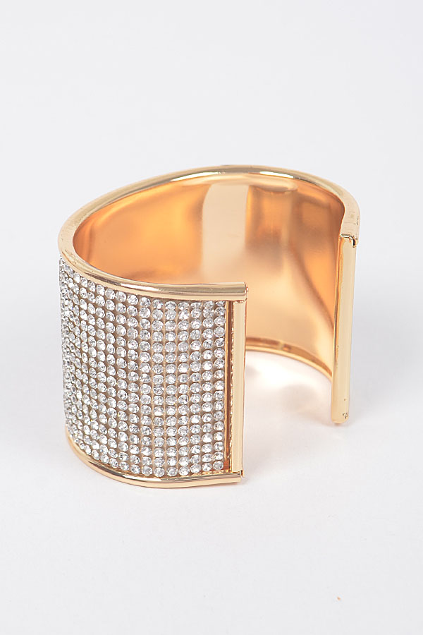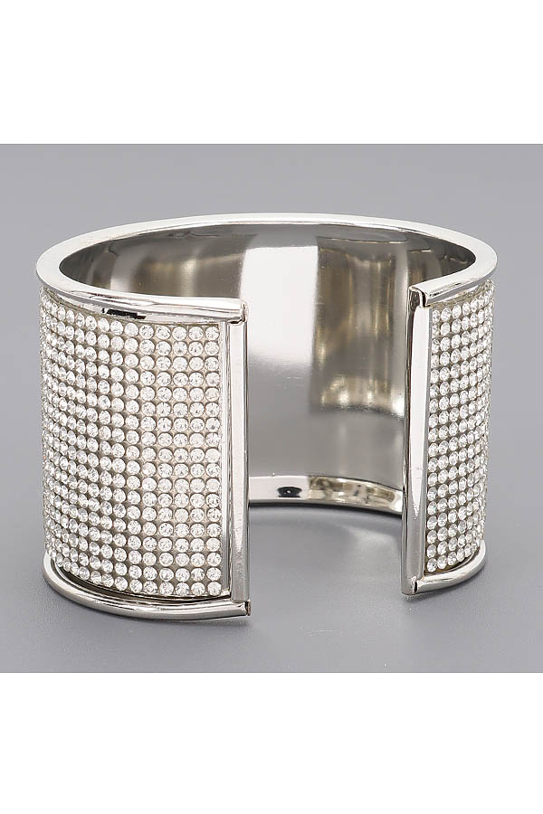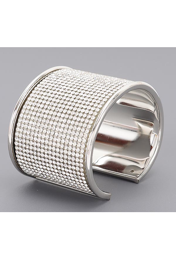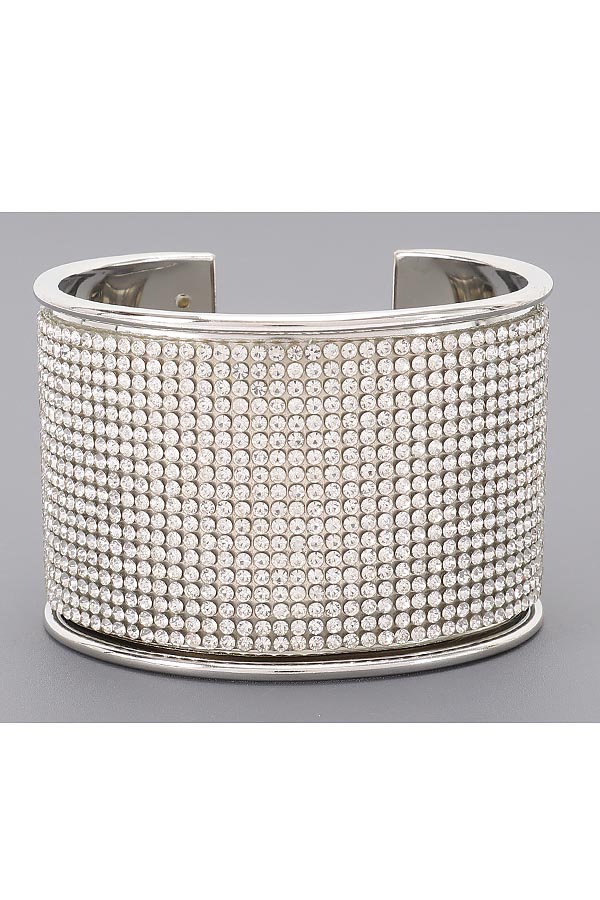 - * This is a Rhinestone Metal Cuff from H&D Accessories. It features a wide band densely adorned with rhinestones, creating a sparkling and eye-catching design. The metal construction gives it a sturdy and elegant look, making it a standout piece of jewelry.
