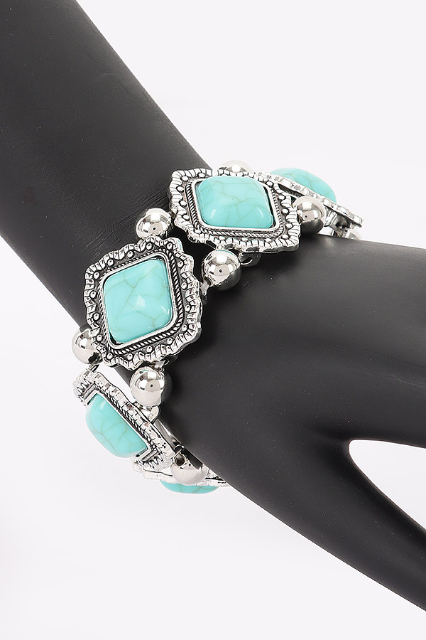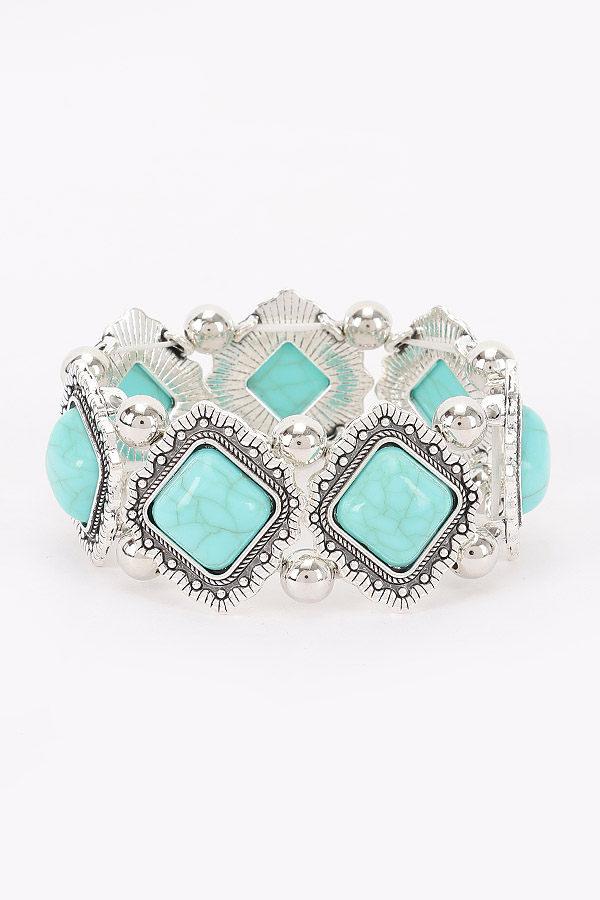 - * This is a Turquoise Bracelet from H&D Accessories. It features a stretchy design with multiple square turquoise stones as the centerpiece. Each stone is surrounded by detailed, silver - tone metal frames with an ornate pattern. Round silver - tone beads are interspersed between the stone - framed elements, adding to the decorative look. The bracelet has a flexible structure, allowing for easy wear and a comfortable fit on different wrist sizes. Ideal for adding a bohemian or Southwestern - inspired touch to outfits, it suits casual outings like music festivals, beach trips, or pairing with denim and flowy tops to create a stylish, laid - back ensemble.