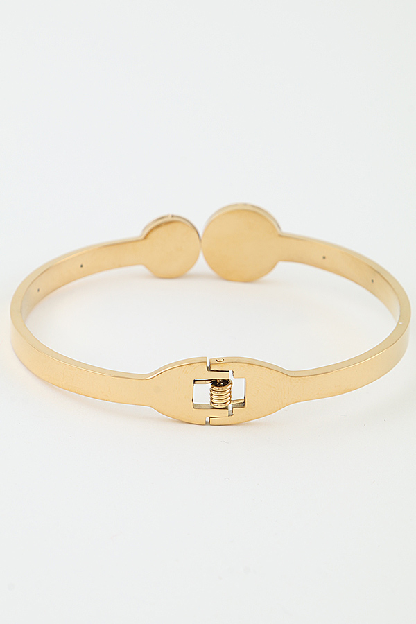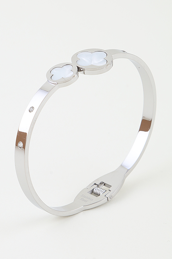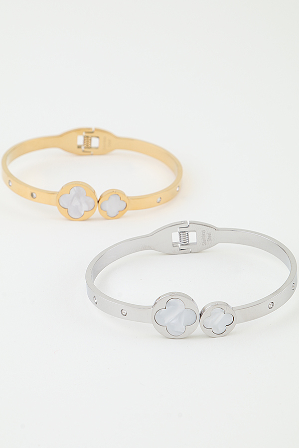 - * This cuff bracelet from H&D Accessories features a sleek, polished metal band adorned with two clover-shaped marble inlays—one larger, one smaller—at its center. The band is accented with small, sparkling crystals along its length, adding a touch of glamour. The spring-loaded clasp ensures a secure and comfortable fit, blending delicate detailing with a modern, refined silhouette.
