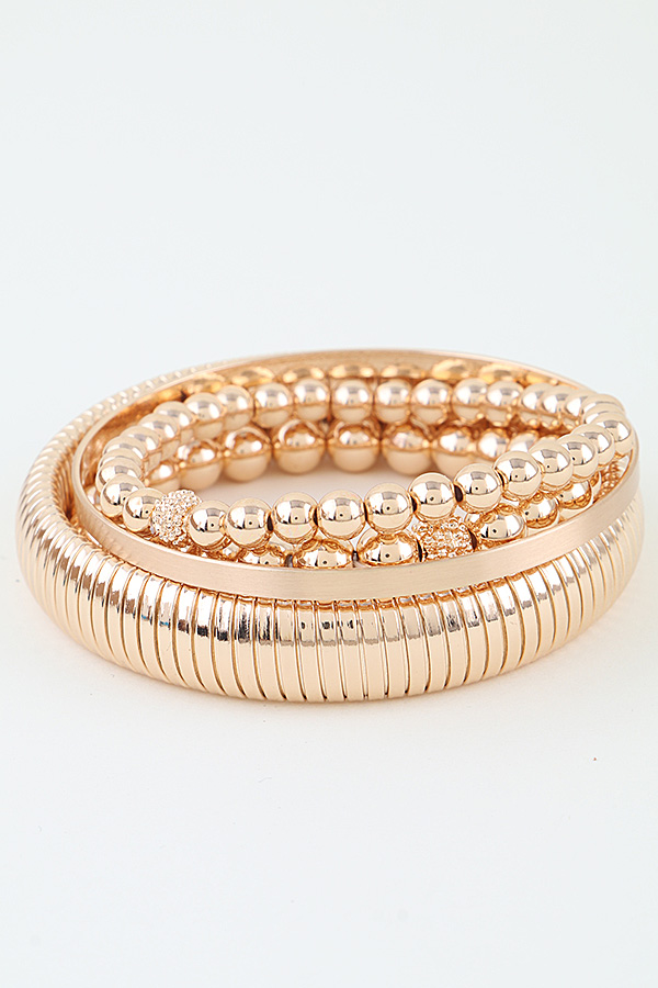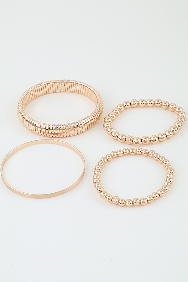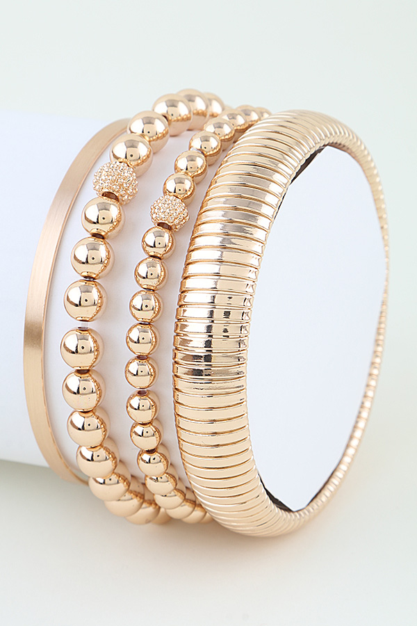 - * These Multi Beaded Cuff Bracelet Set from H&D Accessories features a curated stack of four distinct designs: a sleek brushed metal bangle, two beaded strands with polished spherical beads accented by textured decorative beads, and a flexible ribbed cuff with a continuous coiled structure, all crafted with a smooth reflective finish that catches light to create a cohesive luminous look, with a lightweight flexible construction that ensures comfortable all-day wear, making them ideal for layering to elevate everyday outfits or adding polished glamour to special occasions.
